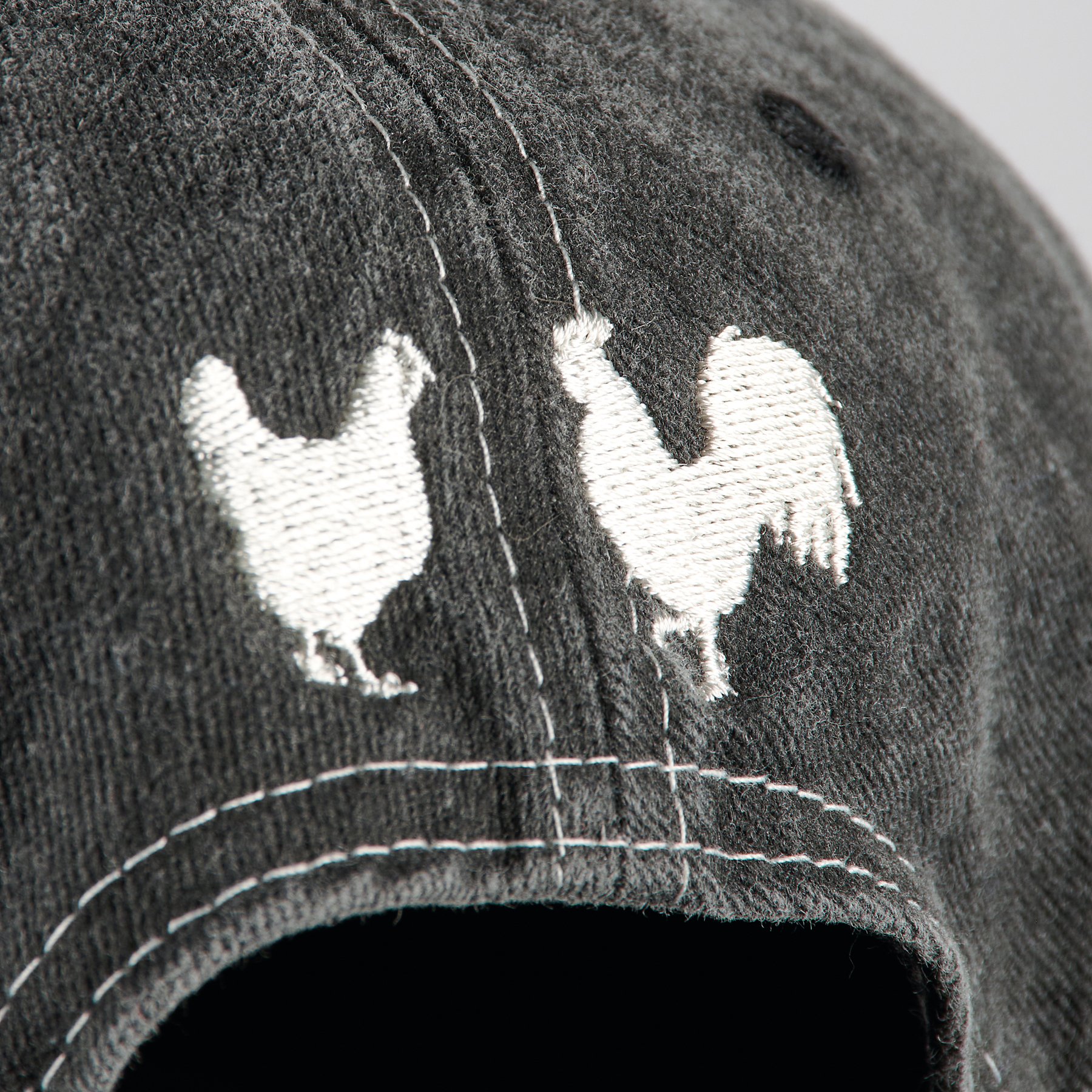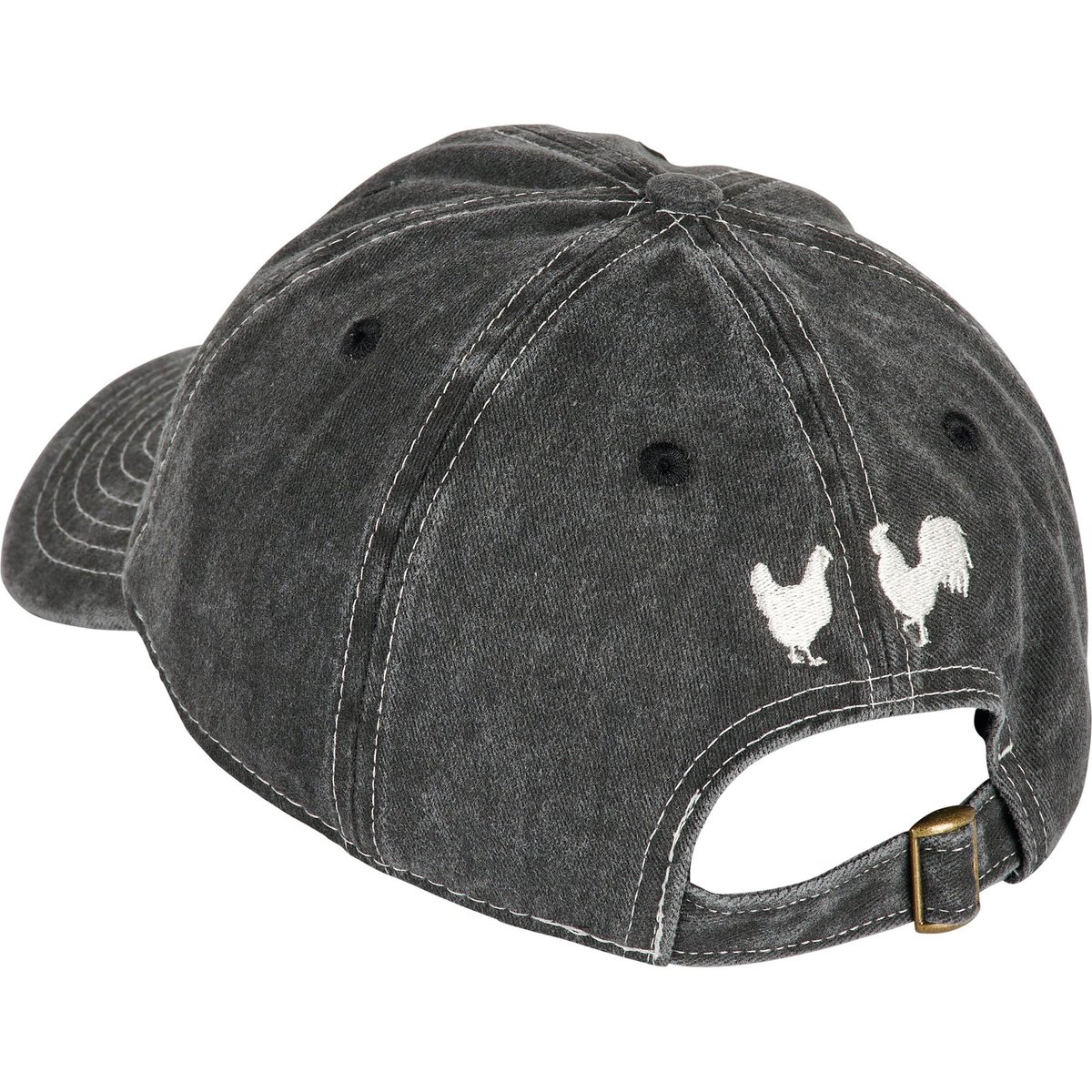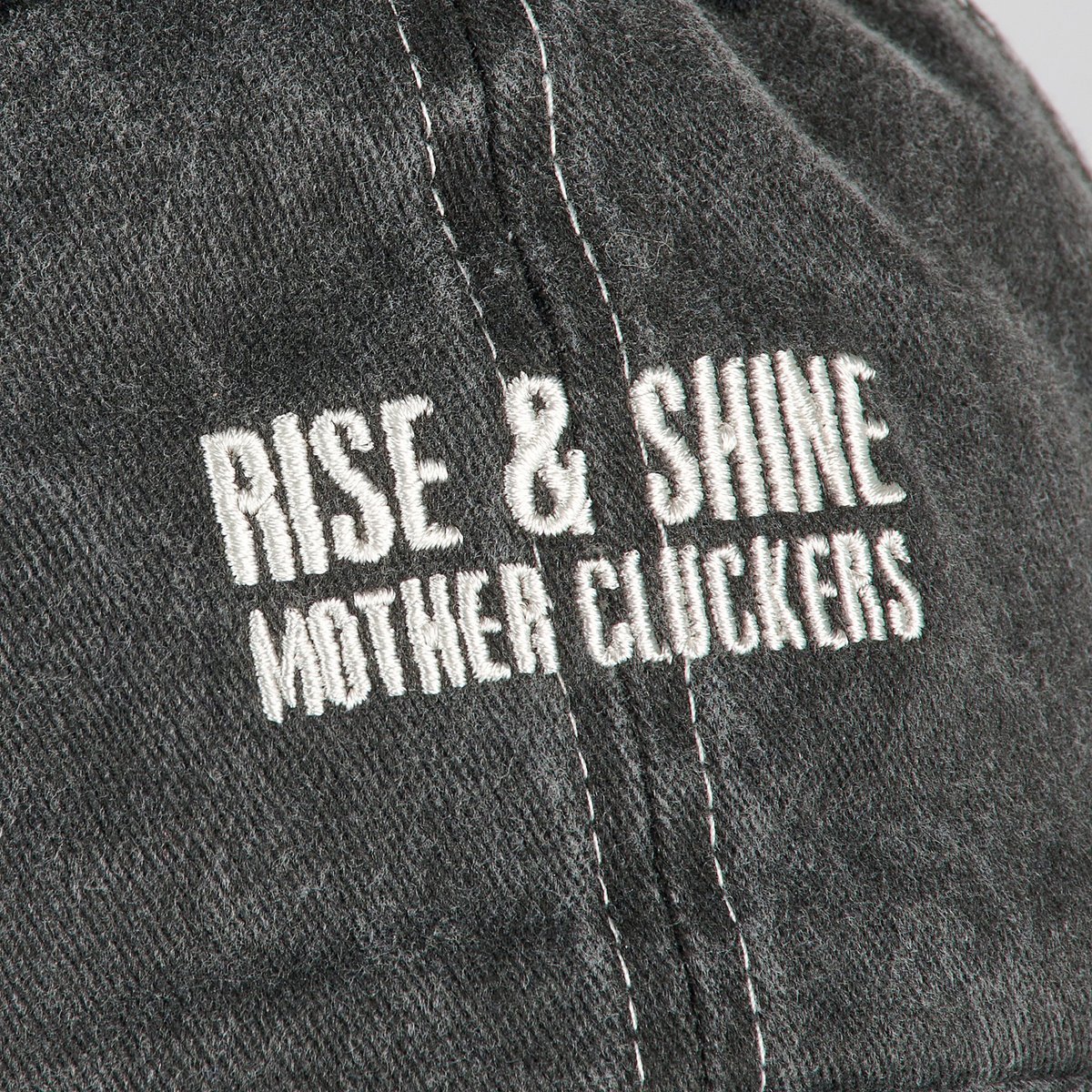 A stonewashed black baseball cap from our Farmhouse Collection displaying a humorous "Rise & Shine Mother Cluckers" sentiment with a rooster and chicken design on the back. Cap features embroidered sentiment and design for added detail. Our Rise & Shine baseball cap is one size fits most with an adjustable buckle closure to create the perfect fit. A stylish accessory option for daily activities. Hand wash only.