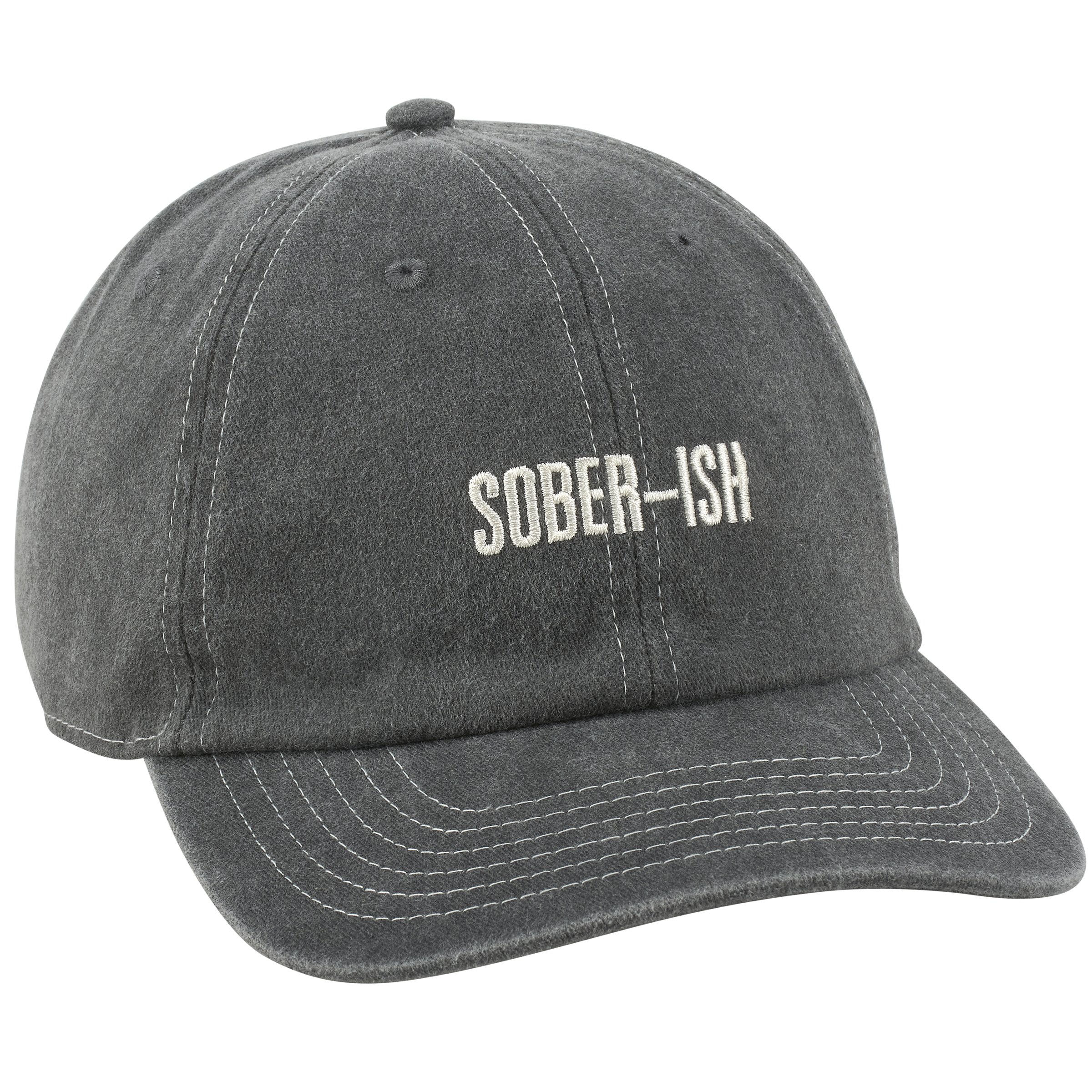 A stonewashed black baseball cap from our Box Sign Style Collection displaying a funny alcohol themed sentiment in a classic box sign style that reads "Sober-ish." This funny drinking hat features a fully embroidered design for added detail. Our Sober-ish baseball cap is one size fits most with an adjustable metal buckle to create the perfect fit. Hand wash only. A fun alcohol themed gift perfect for an everyday accessory.
