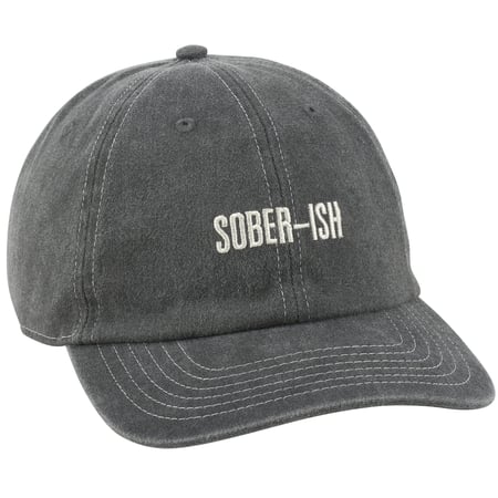 A stonewashed black baseball cap from our Box Sign Style Collection displaying a funny alcohol themed sentiment in a classic box sign style that reads "Sober-ish." This funny drinking hat features a fully embroidered design for added detail. Our Sober-ish baseball cap is one size fits most with an adjustable metal buckle to create the perfect fit. Hand wash only. A fun alcohol themed gift perfect for an everyday accessory.