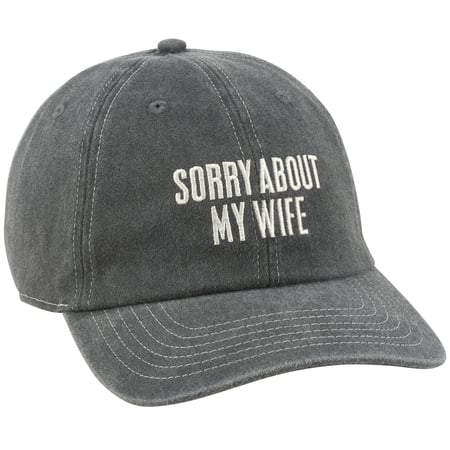 A stonewashed black baseball cap from our Box Sign Style Collection displaying a funny marriage themed sentiment in a classic box sign style that reads "Sorry About My Wife." This funny husband hat features a fully embroidered design for added detail. Our Sorry About My Wife baseball cap is one size fits most with an adjustable metal buckle to create the perfect fit. Hand wash only. A fun gift for husbands perfect for an everyday accessory.