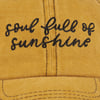 A stonewashed golden yellow baseball cap from our Hand Illustrated Collection displaying an inspirational "Soul Full Of Sunshine" sentiment with black thread accents. Cap features embroidered sentiment for added detail. Our Soul Full Of Sunshine baseball cap is one size fits most with an adjustable buckle closure to create the perfect fit. A stylish accessory option for daily activities. Hand wash only.