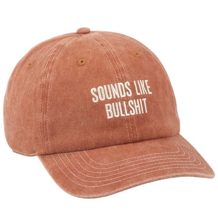 A stonewashed orange baseball cap from our Box Sign Style Collection displaying a sassy sentiment in a classic box sign style that reads "Sounds Like Bullshit." This sassy hat features a fully embroidered design for added detail. Our Sounds Like Bullshit baseball cap is one size fits most with an adjustable metal buckle to create the perfect fit. Hand wash only. A fun gift perfect for an everyday accessory.