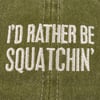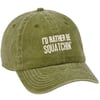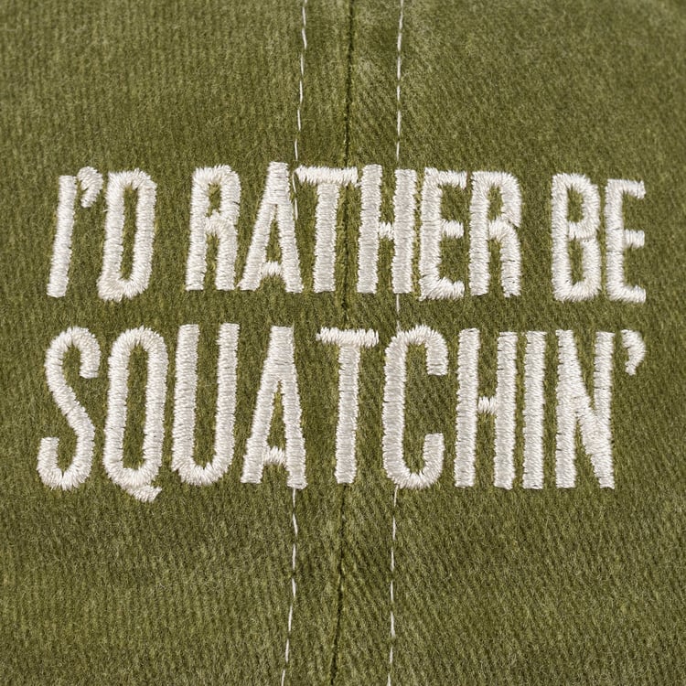 A stonewashed green baseball cap from our Lake & Cabin Collection displaying a fun bigfoot inspired sentiment in a box sign style that reads "I'd Rather Be Squatchin'." Bigfoot hat features fully embroidered sentiment for added detail. Our Squatchin' baseball cap is one size fits most with an adjustable metal buckle to create the perfect fit. Hand wash only. A fun bigfoot-themed gift perfect for an everyday accessory.