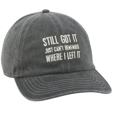 A stonewashed black baseball cap from our Box Sign Style Collection displaying a funny sentiment in a classic box sign style that reads "Still Got It - Just Can't Remember Where I Left It." This funny hat features a fully embroidered design for added detail. Our Still Got It baseball cap is one size fits most with an adjustable metal buckle to create the perfect fit. Hand wash only. A fun gift perfect for an everyday accessory.