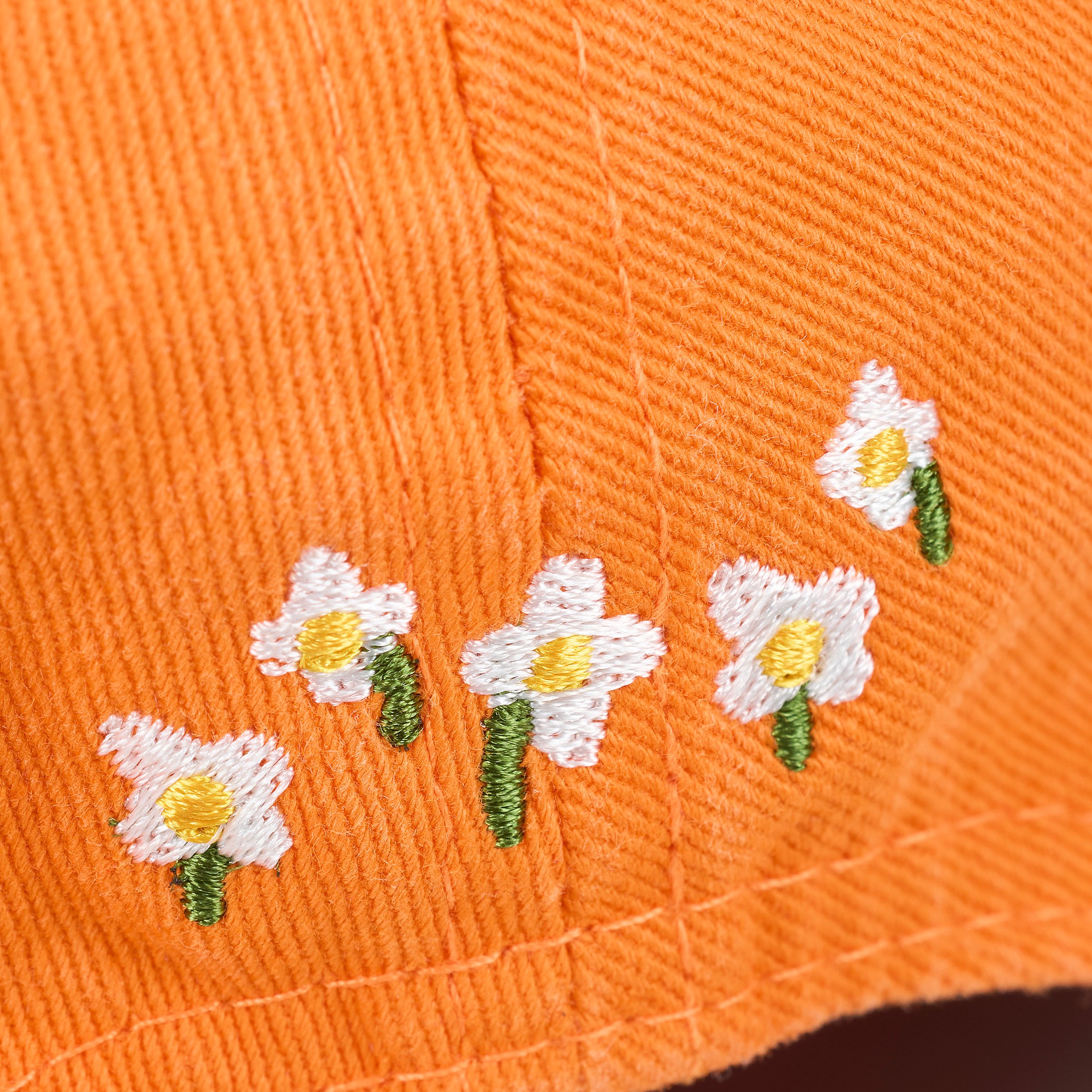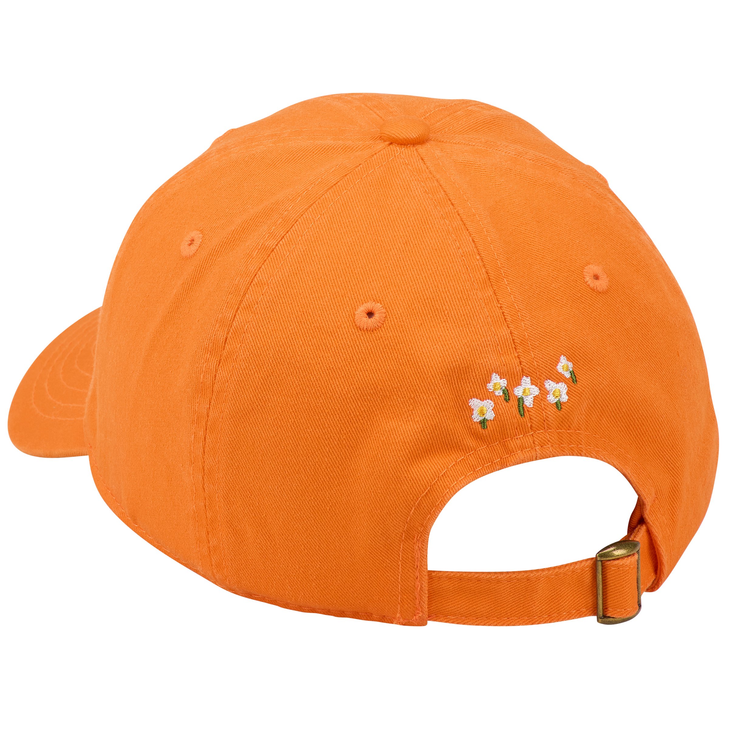 A bright orange baseball cap from our Inspiration & Blooms Collection displaying an embroidered design of a happy shining sun and flowers on the front with coordinating flower designs on the back. Embroidered designs are replicated from original hand illustrated art. Our Sunshine baseball cap is one size fits most with an adjustable metal buckle to create the perfect fit. Hand wash only. An inspirational accessory perfect for everyday style and great for gifting.
