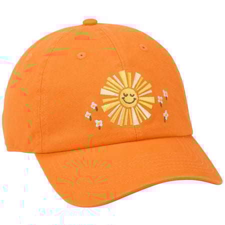 A bright orange baseball cap from our Inspiration & Blooms Collection displaying an embroidered design of a happy shining sun and flowers on the front with coordinating flower designs on the back. Embroidered designs are replicated from original hand illustrated art. Our Sunshine baseball cap is one size fits most with an adjustable metal buckle to create the perfect fit. Hand wash only. An inspirational accessory perfect for everyday style and great for gifting.