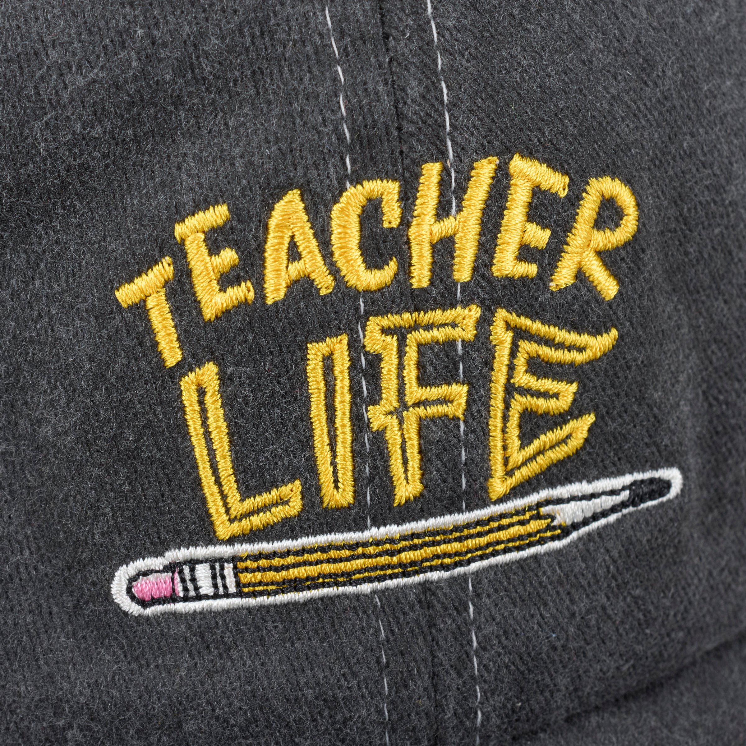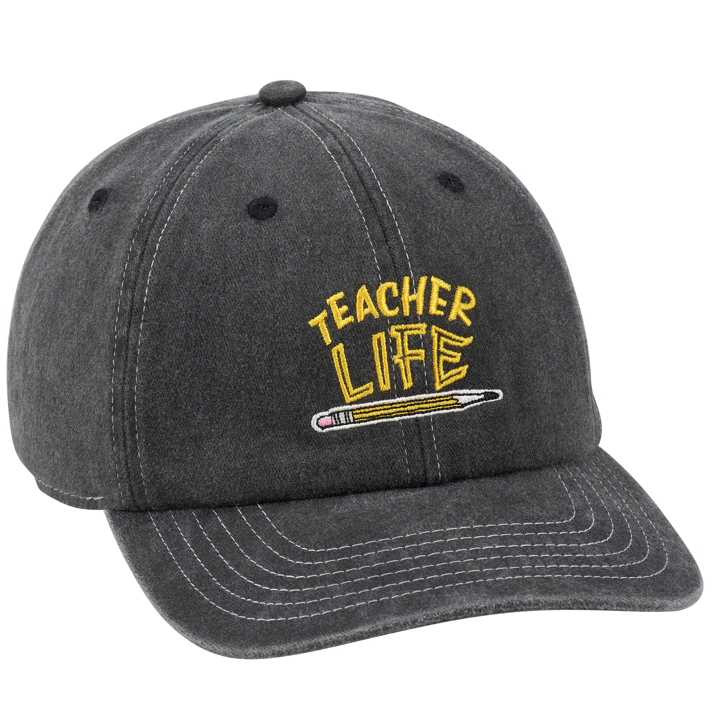 A stonewashed cotton baseball cap from our Teacher Gift Collection displaying a school pencil under a fun teacher inspired sentiment that reads "Teacher Life." Teacher hat features a fully embroidered design that replicates all of the details of the original hand illustrated art. Our Teacher Life baseball cap is one size fits most with an adjustable metal buckle to create the perfect fit. Hand wash only. A fun teacher gift perfect for an everyday accessory.