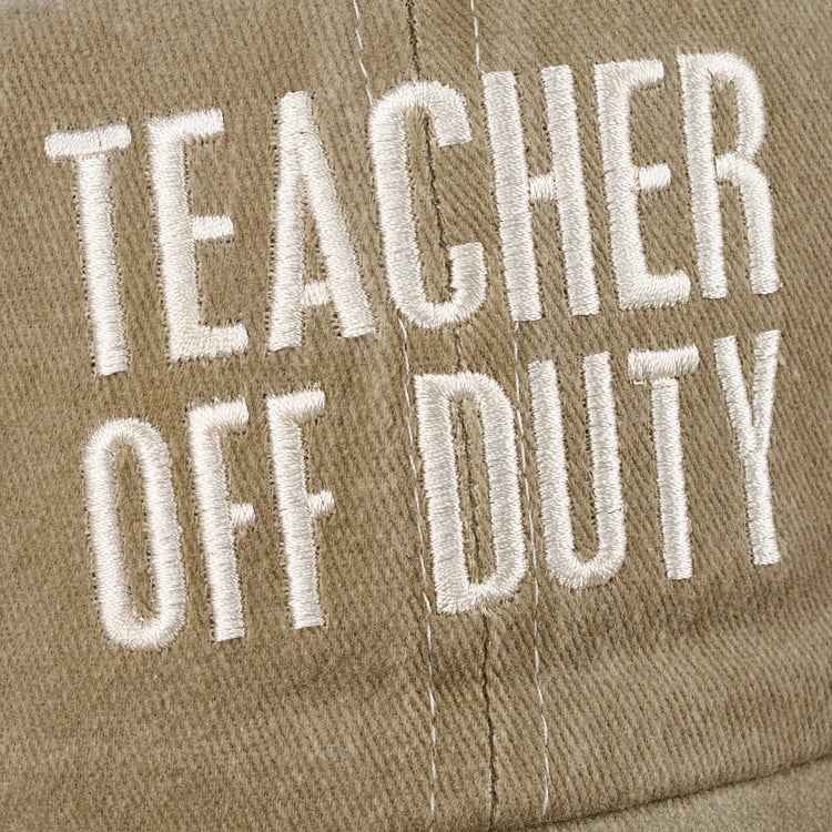 A tan baseball cap from our Teacher Collection displaying a fun teacher inspired sentiment in a box sign style that reads "Teacher Off Duty." Funny teacher hat features fully embroidered sentiment for added detail. Our Teacher Off Duty baseball cap is one size fits most with an adjustable metal buckle to create the perfect fit. Hand wash only. A fun teacher gift perfect for an everyday accessory.
