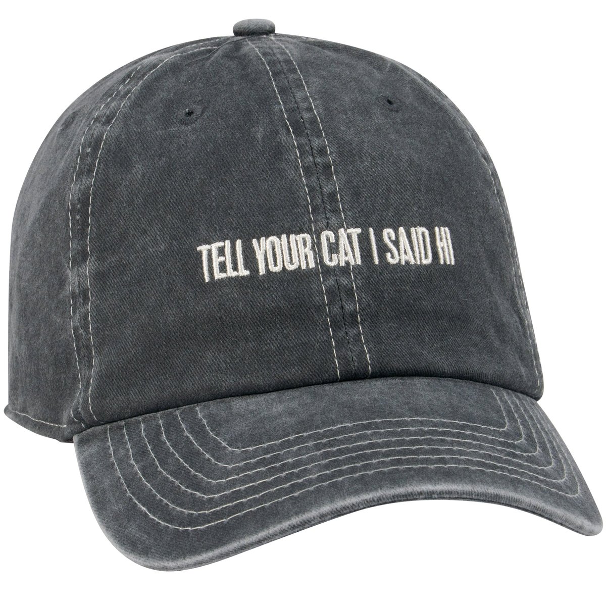 A cotton baseball cap with an adjustable brass closure on the back. Features "Tell Your Cat I Said Hi" sentiment embroidered in cream onto charcoal base. One size fits most. Hand-wash only.