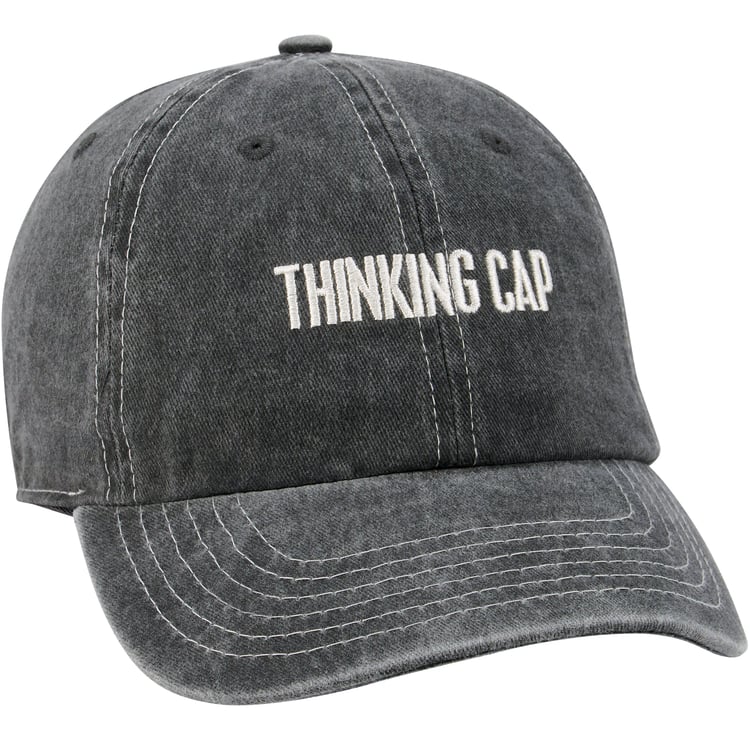 A Thinking Cap hat from our Box Sign Style Collection comes with an adjustable brass closure on the back. Features "Thinking Cap" sentiment embroidered in cream onto charcoal base. Our Thinking Cap baseball cap is one size fits most. Hand-wash only.