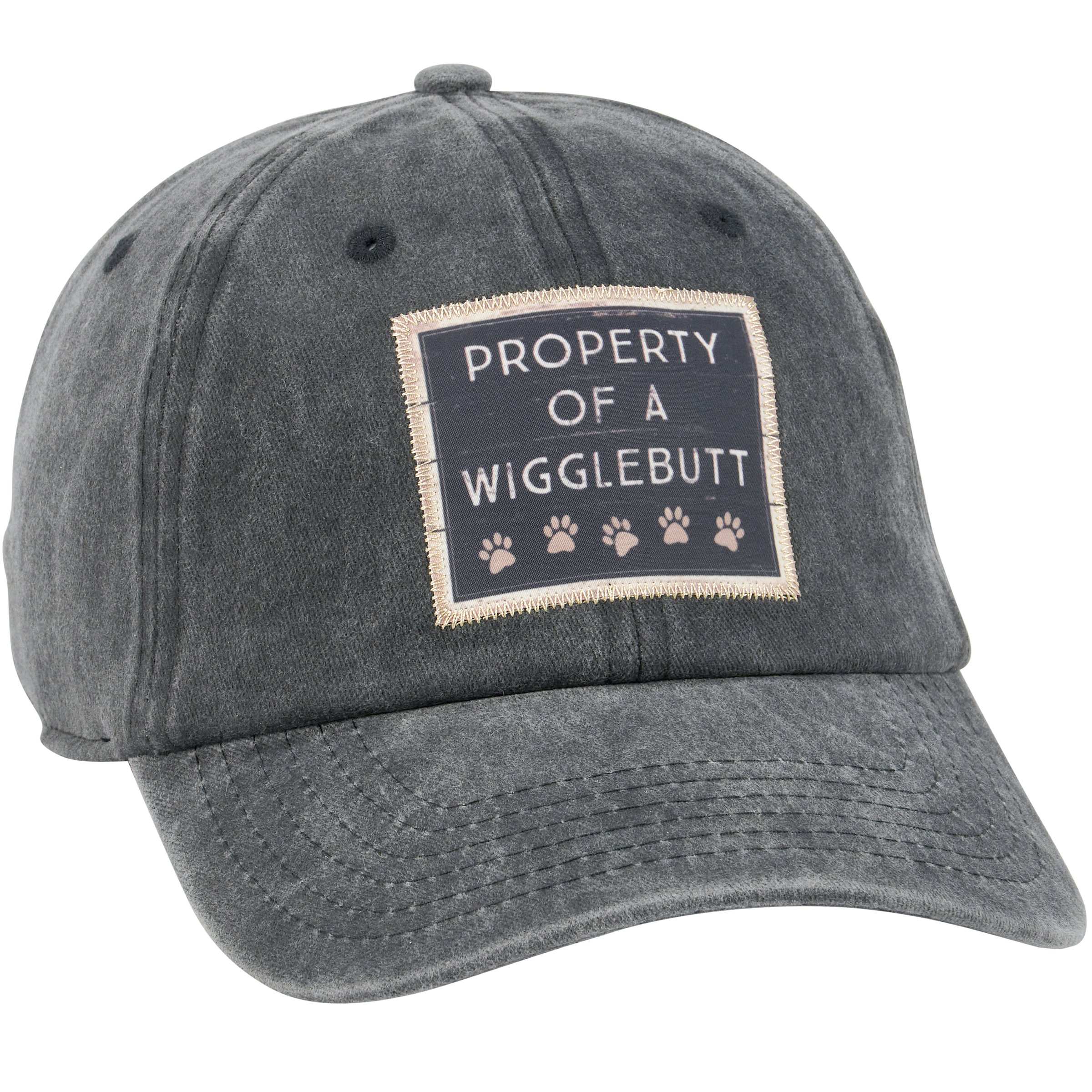 A stonewashed black baseball cap from ourĀ Pet Collection featuring a stitched art panel on the front displaying a rustic pet inspired sentiment that reads "Property Of A Wigglebutt" with embroidered paw prints on the back. Art panel features embroidered border for added detail. Our Wigglebutt baseball cap is one size fits most with an adjustable buckle closure to create the perfect fit. A fun pet-themed baseball cap perfect for an everyday accessory. Hand wash only.