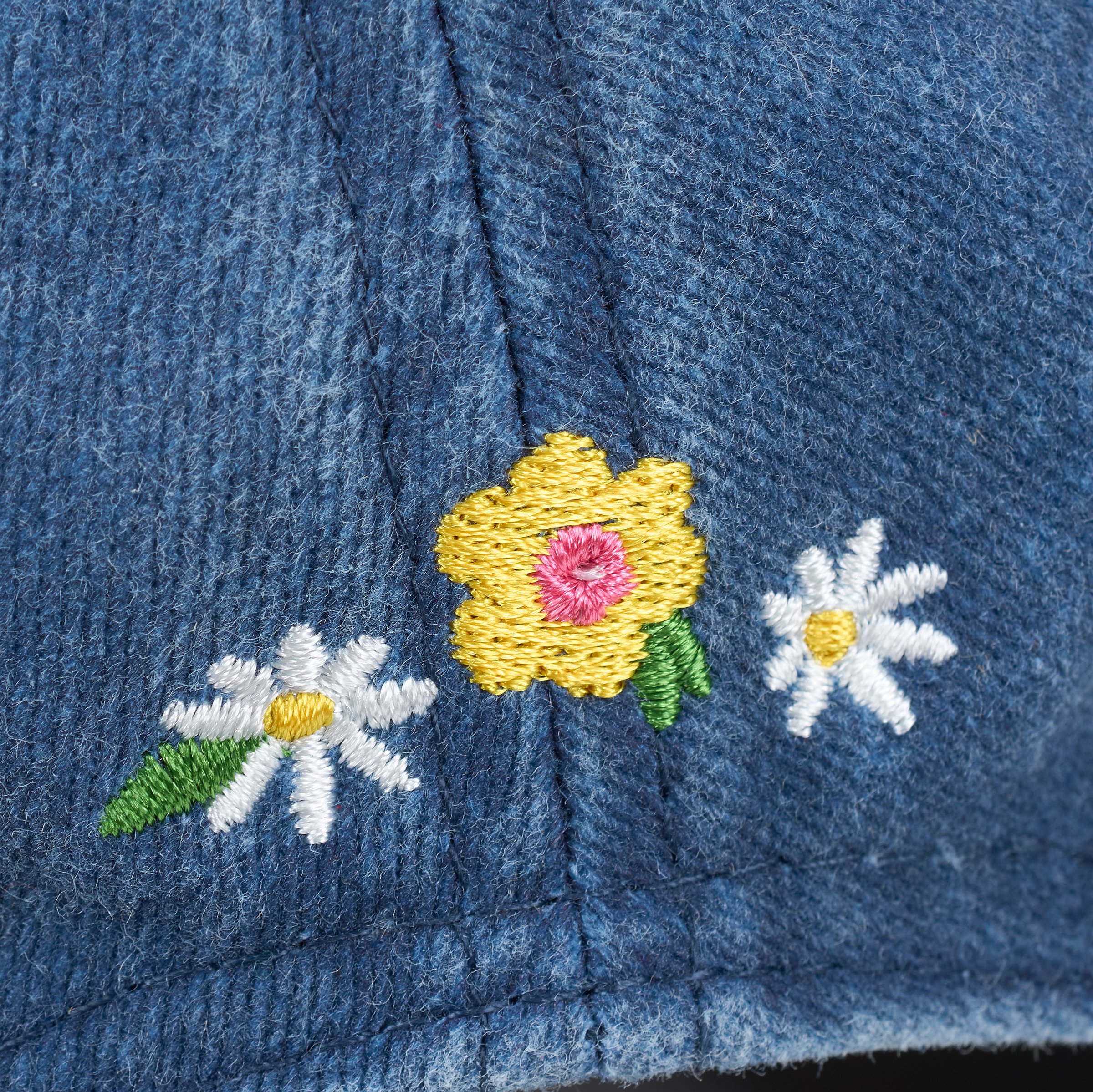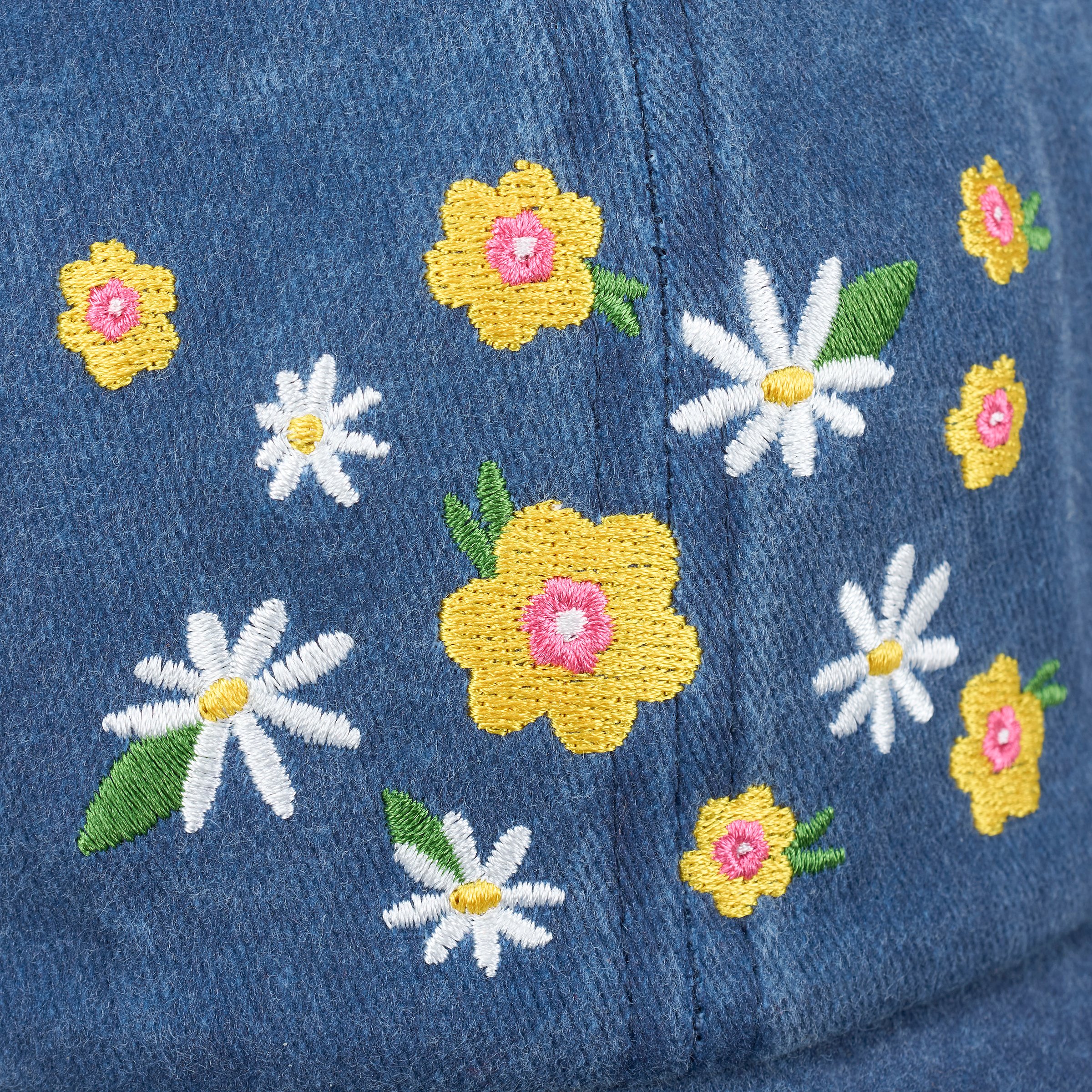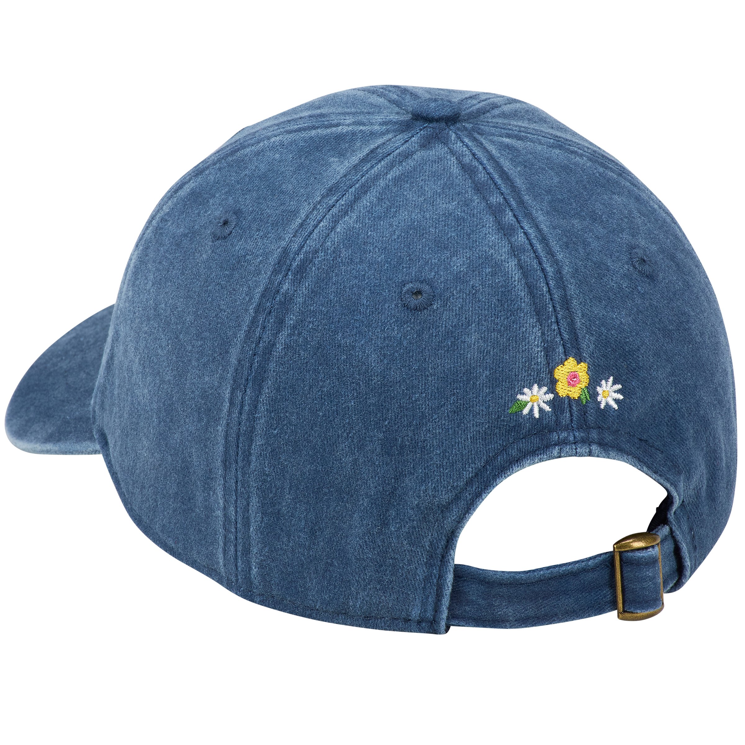 A blue baseball cap from our Inspiration & Blooms Collection displaying embroidered designs of various yellow flowers on the front with coordinating yellow flower designs on the back. Embroidered flower designs are replicated from original hand illustrated art. Our Yellow Flower baseball cap is one size fits most with an adjustable metal buckle to create the perfect fit. Hand wash only. An inspirational nature themed accessory perfect for everyday style and great for gifting.