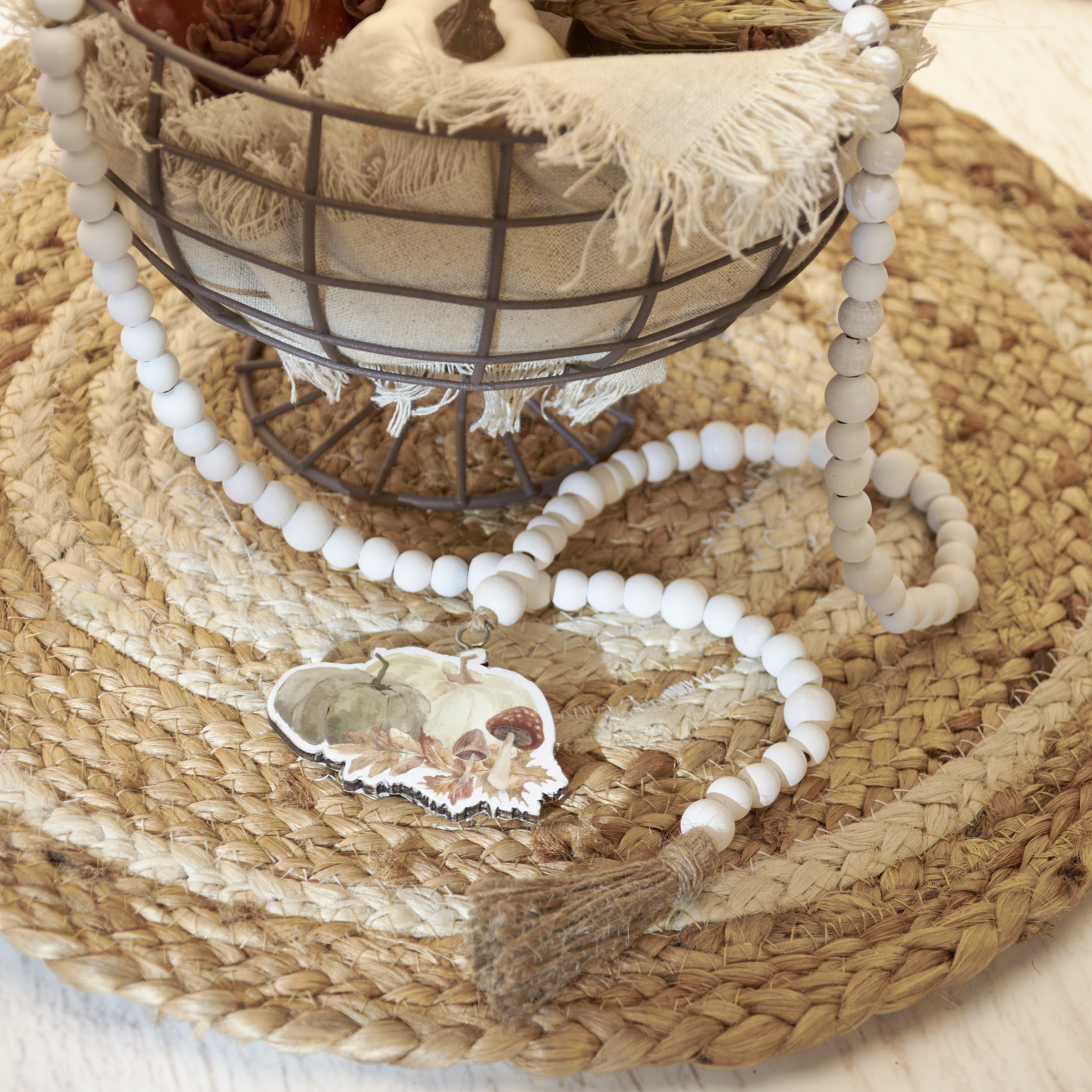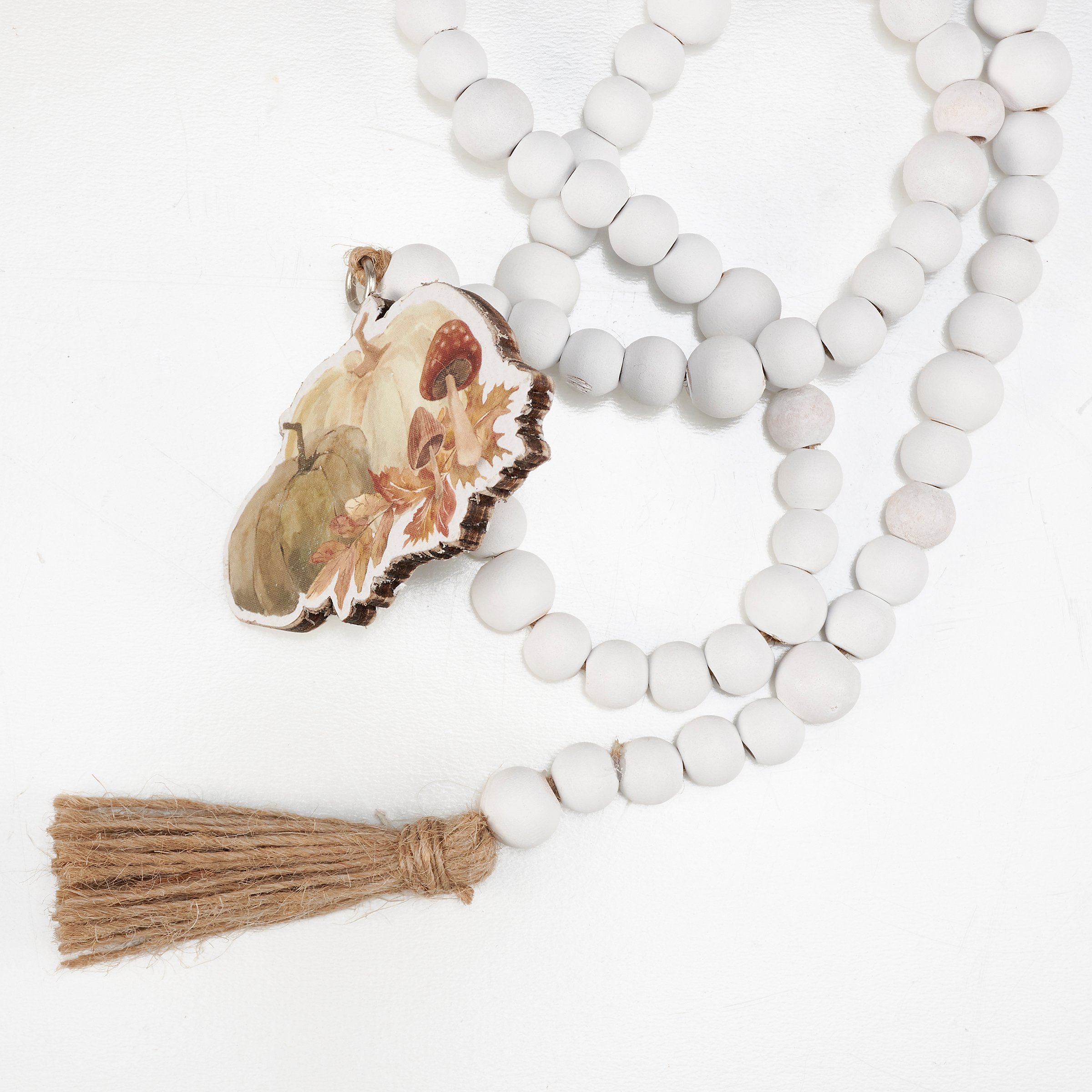 A decorative garland from our Fall & Harvest Collection featuring cream colored wooden beads along a jute rope with a jute tassel at one end and a double-sided medallion at the other end. Medallion displays a hand painted design of pumpkins with mushrooms and autumn leaves in a watercolor style. Our Fall Pumpkins beaded garland includes 42 inches of length for plenty of coverage that can be laid on a surface for display. A rustic seasonal home accent with a variety of display options.