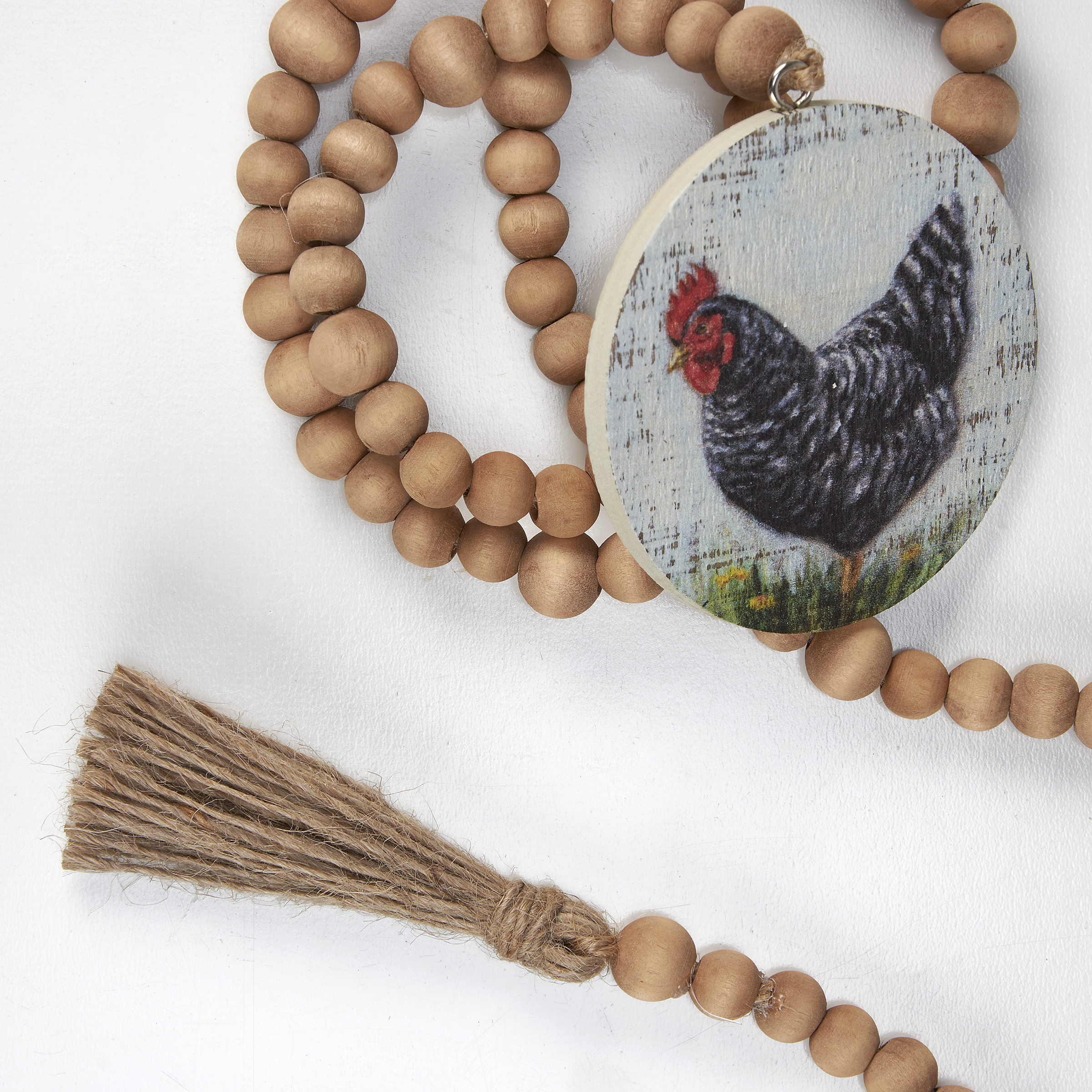 A decorative garland from our Farmhouse Collection featuring natural wood beads along a jute rope with a jute tassel at one end and a double-sided medallion at the other end. Medallion displays a hand painted design of a Plymouth Rock chicken in a field replicated from original artwork painted onto burlap canvas, giving the art a unique depth and texture. Our Plymouth Rock Chicken beaded garland includes 42 inches of length for plenty of coverage that can be laid on a surface for display. A rustic everyday home accent with a variety of display options.