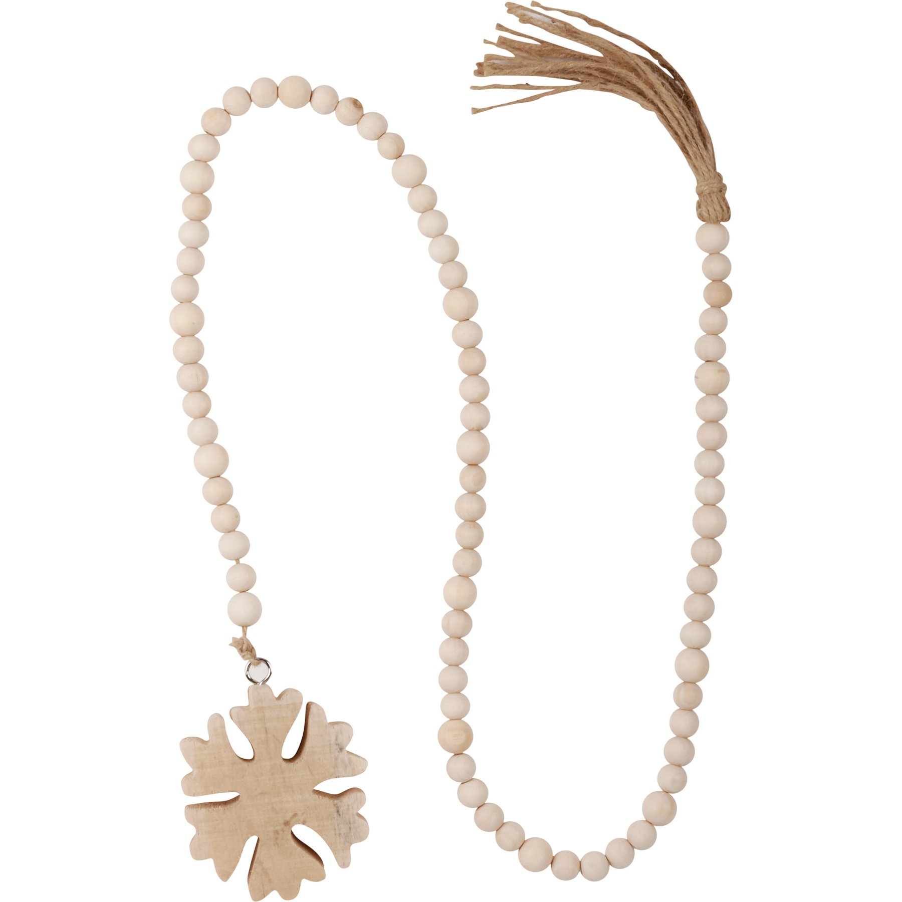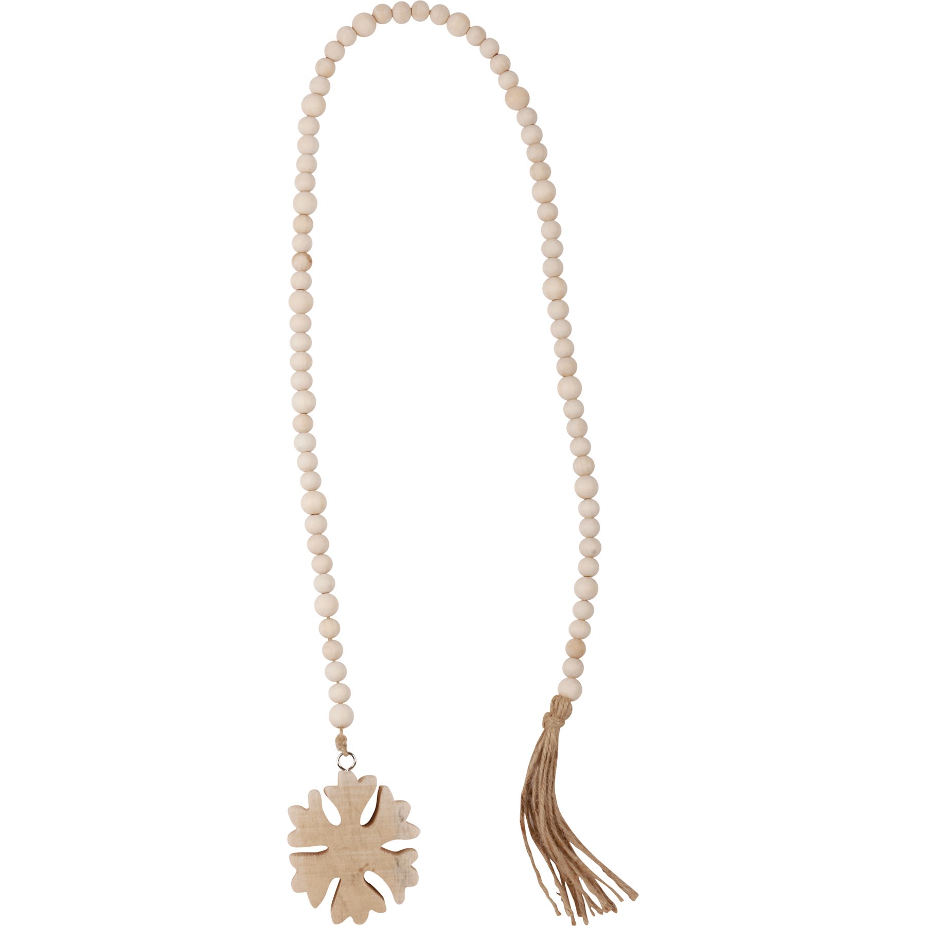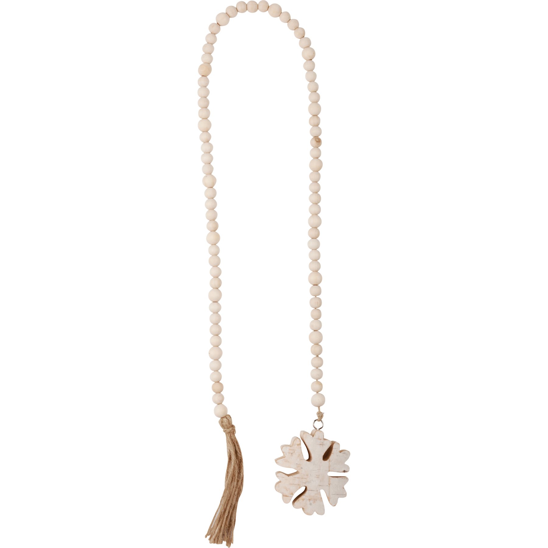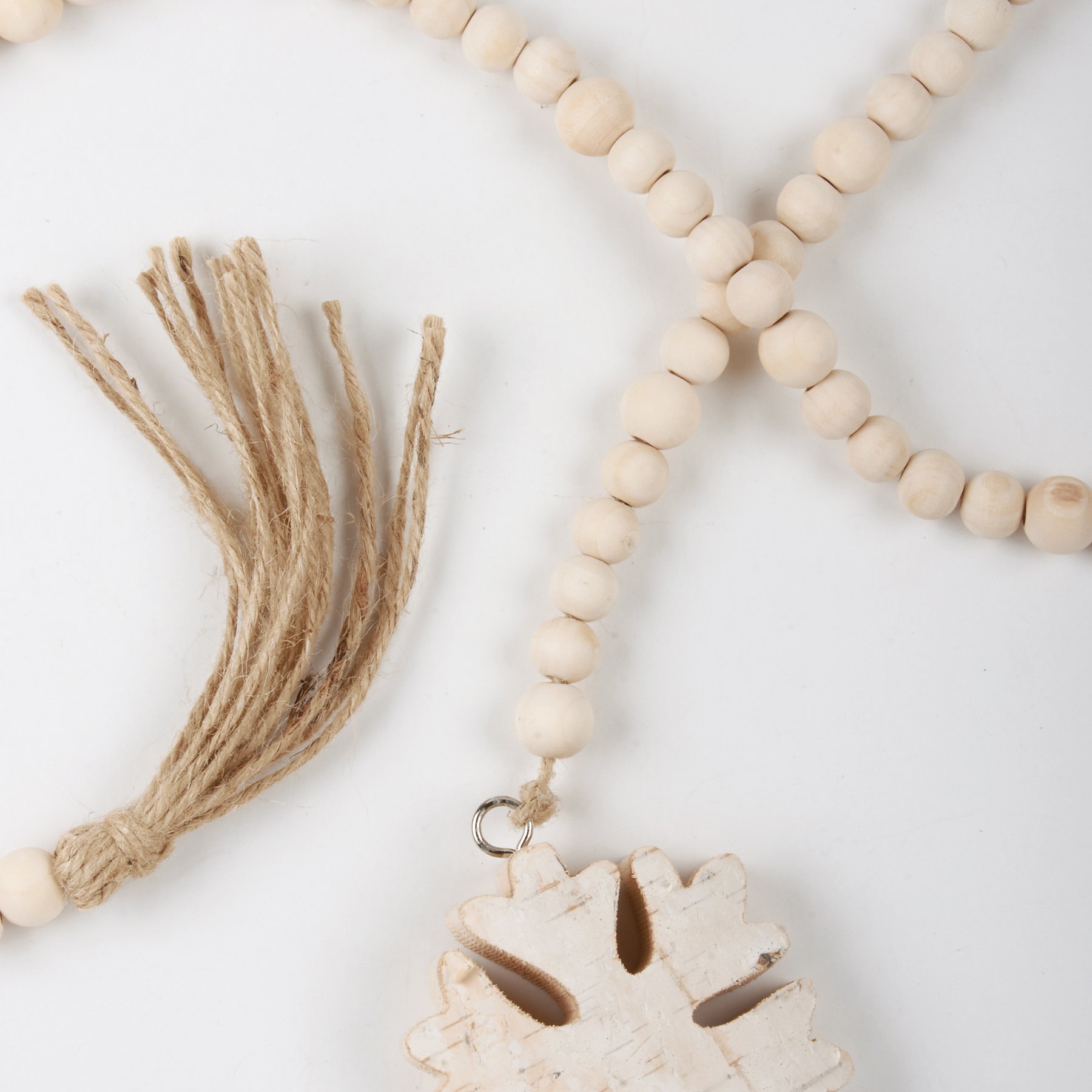 A bohemian style garland displaying natural holiday color palette. Garland features snowflake cutout of natural wood with tail of wooden beads and jute tassel. The Snowflake beaded garland coordinates well with other bohemian décor from our Christmas Collection.