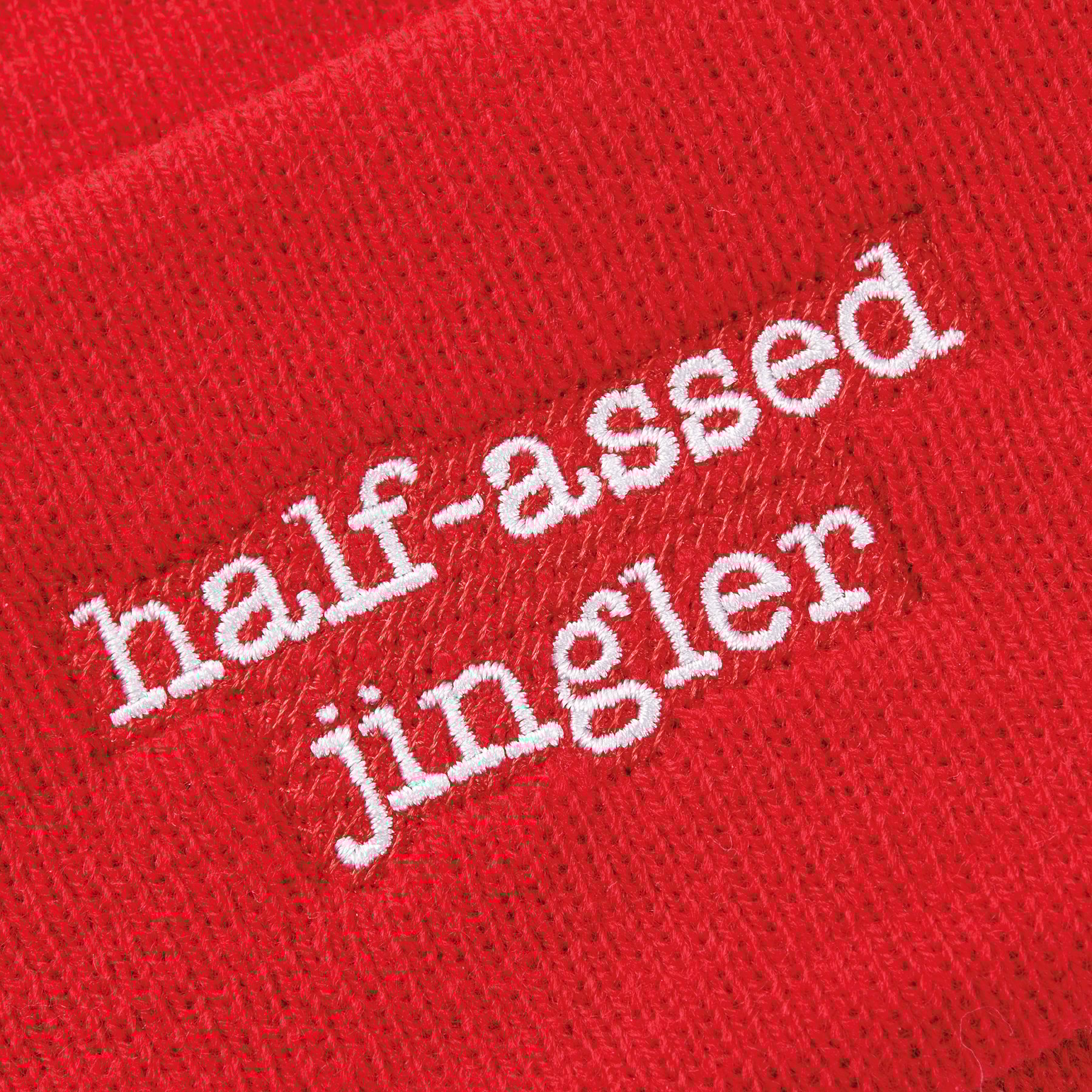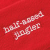 A beanie from our Christmas Collection displaying a holiday red and white color palette with sassy "Half-Assed Jingler" sentiment. Sentiment is fully embroidered for added detail. Our Half-Assed Jingler beanie is one size fits most. A fun accessory option for seasonal events or gifting. Hand-wash only.