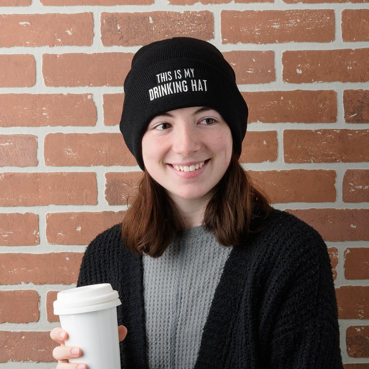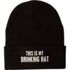 Equal parts cozy and cute, this black beanie features a box sign style design with embroidered "This Is My Drinking Hat" sentiment. One size fits most. Hand wash only.