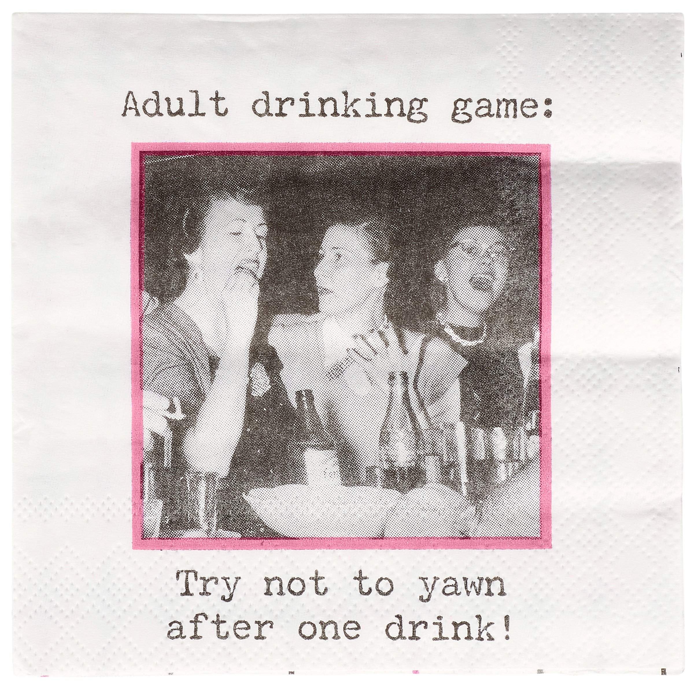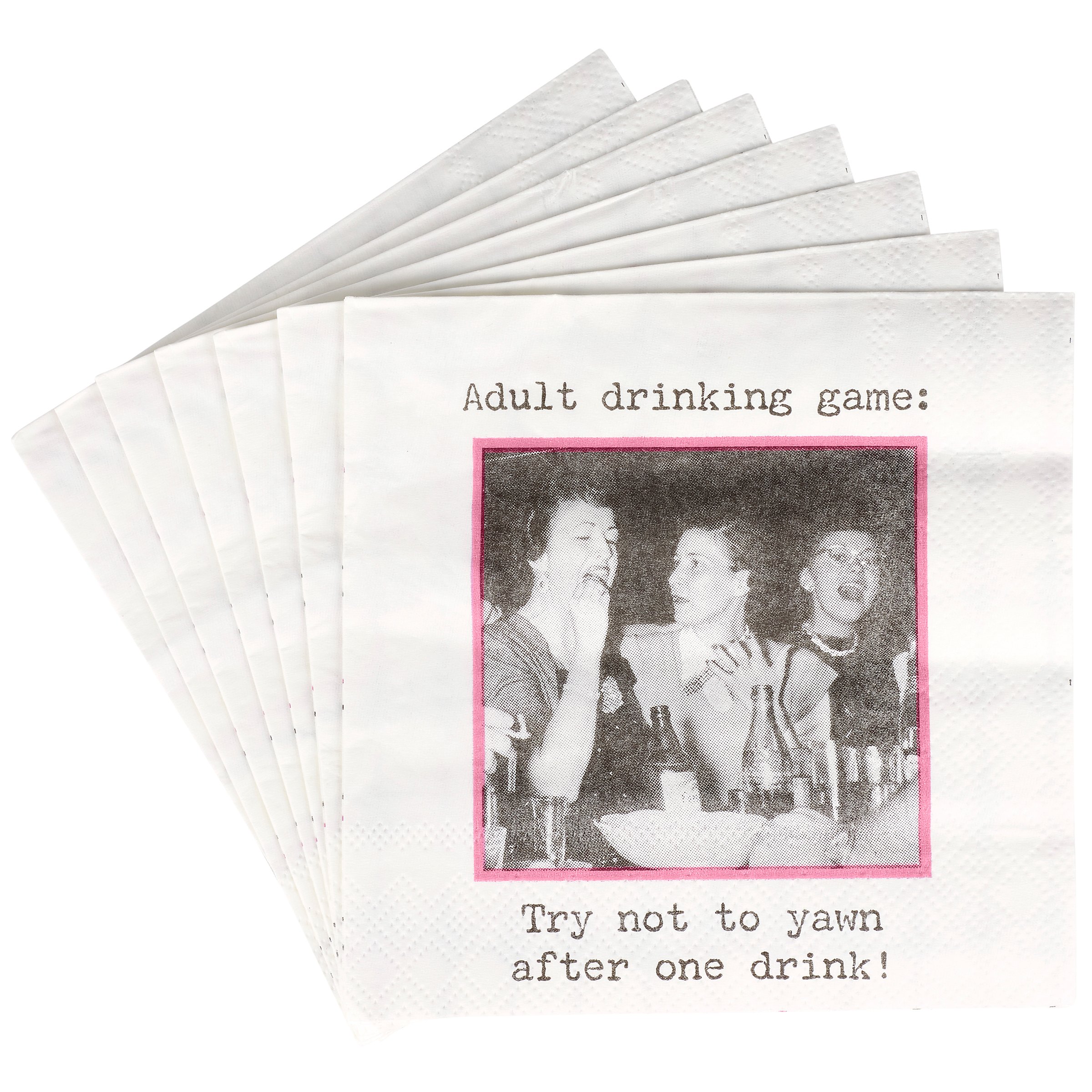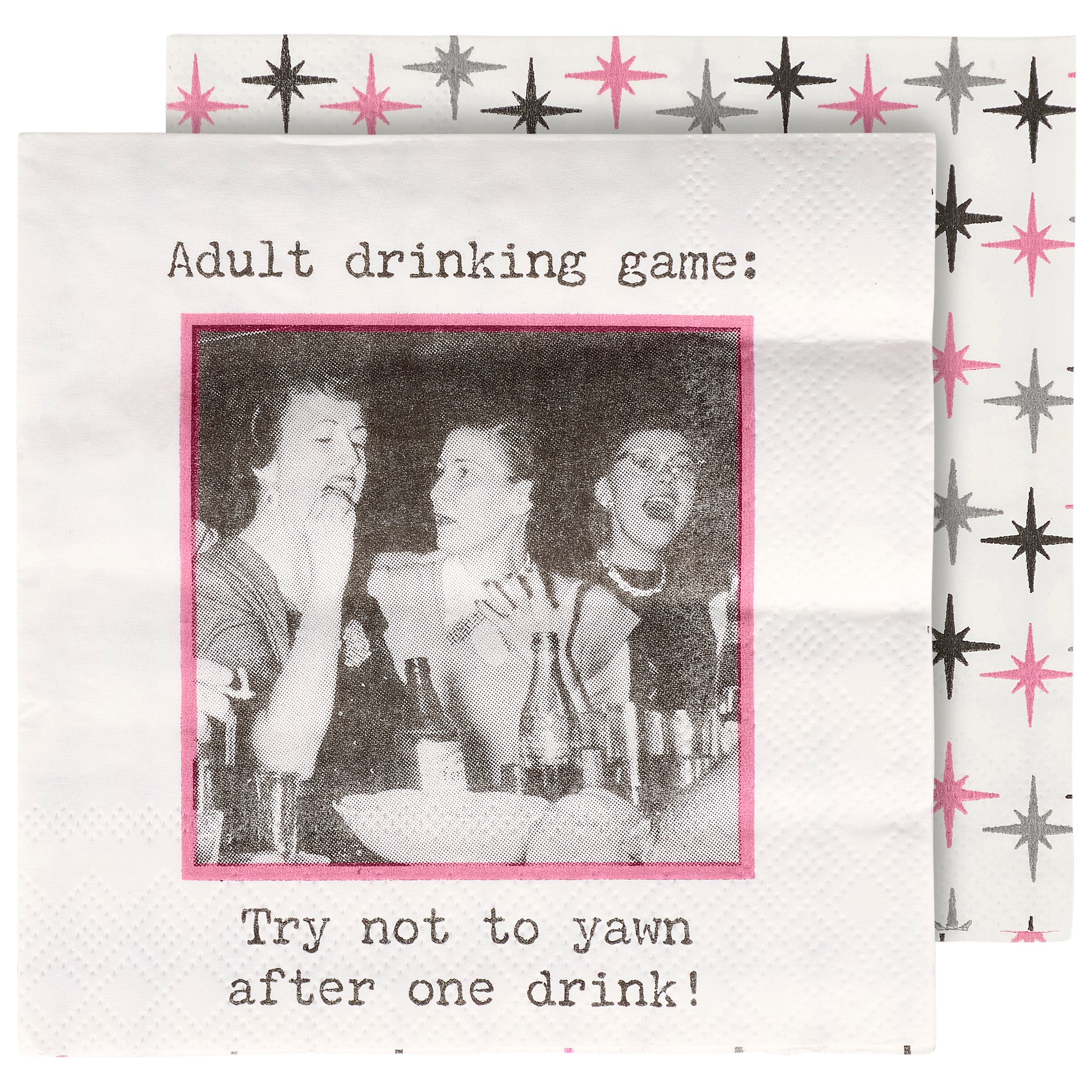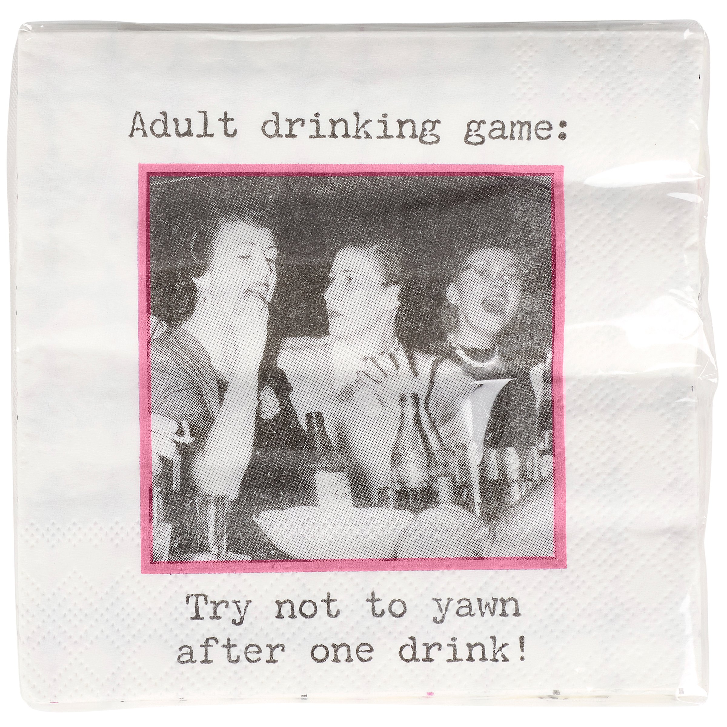 Perfect for entertaining guests and making clean-up a breeze, this disposable beverage napkin from our Trash Talk By Annie Collection displays a vintage black and white photograph complemented with a sassy alcohol themed sentiment that reads "Adult Drinking Game: Try Not To Yawn After One Drink!" Beverage napkin also features a coordinating retro pattern on the back when flipped as well as the rest of the napkin when unfolded. Our Adult Drinking Game beverage napkin measures 5" by 5" and comes shrink-wrapped in a set of 20 napkins. A fun retro bar accessory perfect for everyday gatherings.