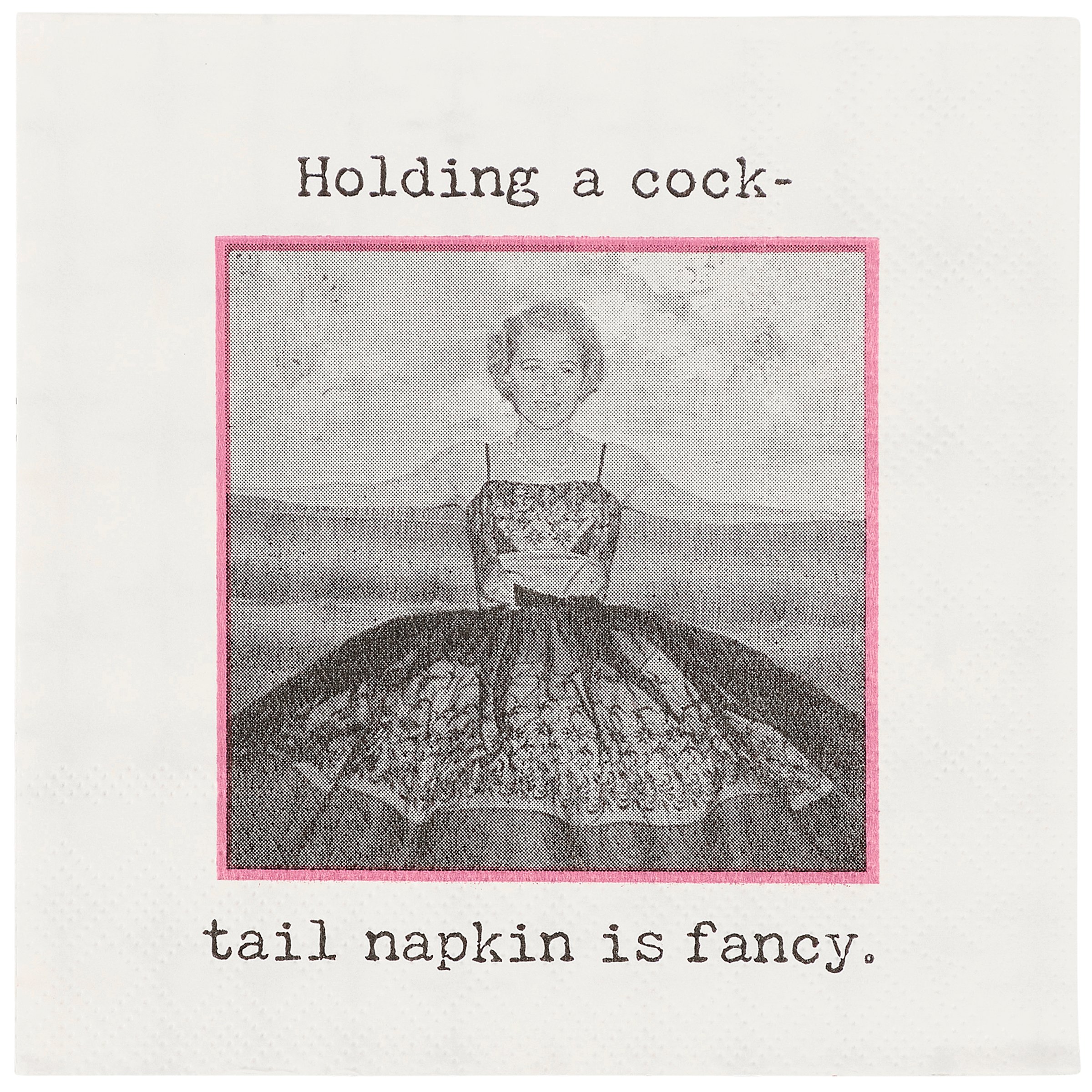 Perfect for entertaining guests and making clean-up a breeze, this disposable beverage napkin from our Trash Talk By Annie Collection displays a vintage black and white photograph complemented with a humorous sentiment that reads "Holding A Cock-tail Napkin Is Fancy." Beverage napkin also features a coordinating retro pattern on the back when flipped as well as the rest of the napkin when unfolded. Our Fancy beverage napkin measures 5" by 5" and comes shrink-wrapped in a set of 20 napkins. A fun retro bar accessory perfect for everyday use.