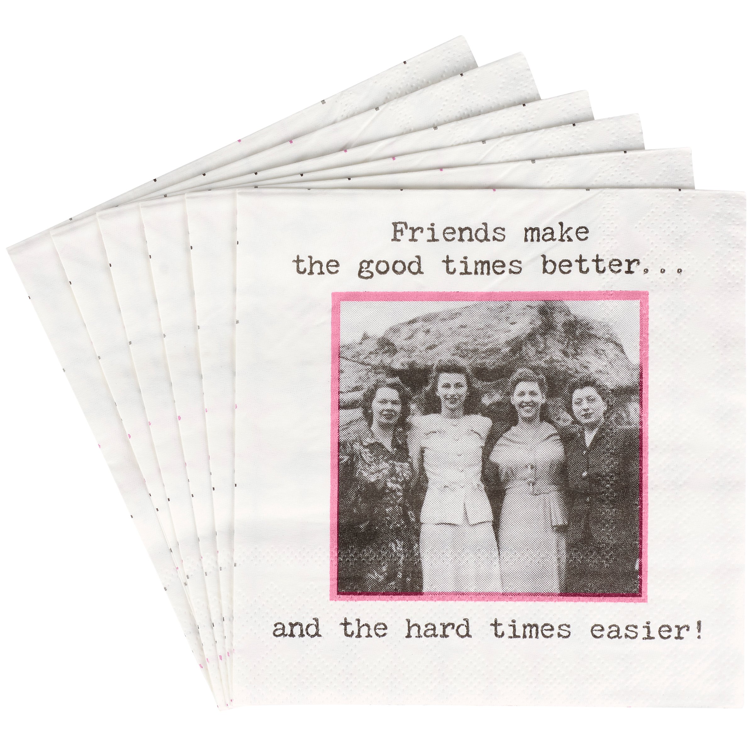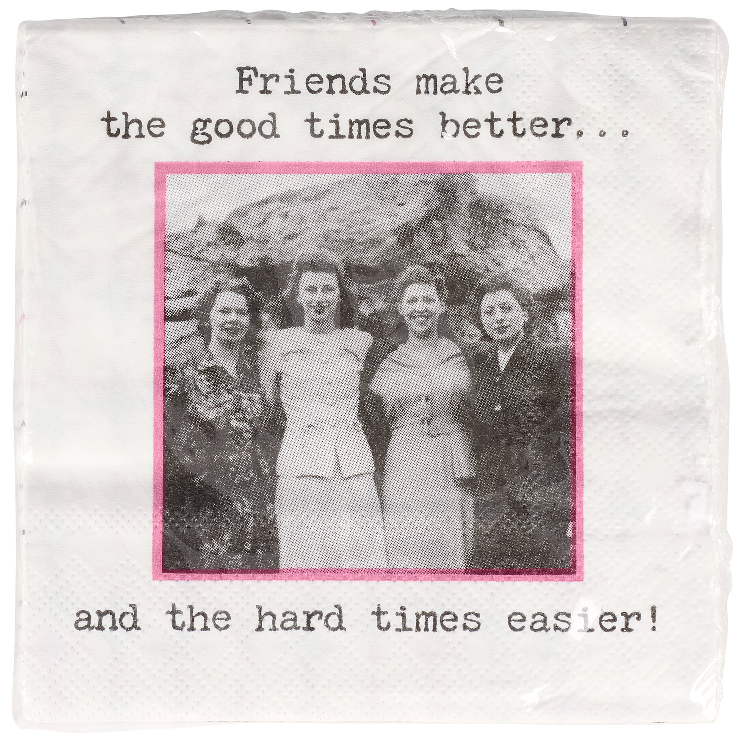 Perfect for entertaining guests and making clean-up a breeze, this disposable beverage napkin from our Trash Talk By Annie Collection displays a vintage black and white photograph complemented with a fun friend themed sentiment that reads "Friends Make The Good Times Better... And The Hard Times Easier!" Beverage napkin also features a coordinating retro pattern on the back when flipped as well as the rest of the napkin when unfolded. Our Friends Make Good Times beverage napkin measures 5" by 5" and comes shrink-wrapped in a set of 20 napkins. A fun retro bar accessory perfect for everyday gatherings.