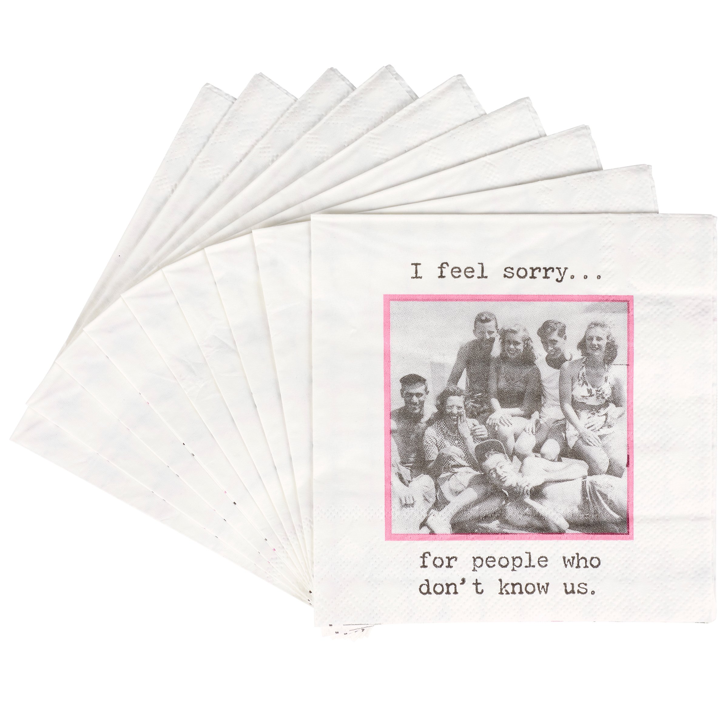 Perfect for entertaining guests and making clean-up a breeze, this disposable beverage napkin from our Trash Talk By Annie Collection displays a vintage black and white photograph complemented with a sassy friend themed sentiment that reads "I Feel Sorry... For People Who Don't Know Us." Beverage napkin also features a coordinating retro pattern on the back when flipped as well as the rest of the napkin when unfolded. Our I Feel Sorry For People beverage napkin measures 5" by 5" and comes shrink-wrapped in a set of 20 napkins. A fun retro bar accessory perfect for everyday gatherings.