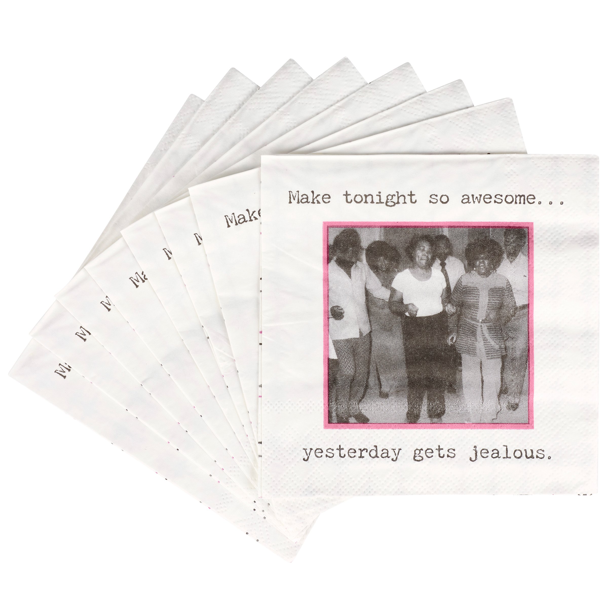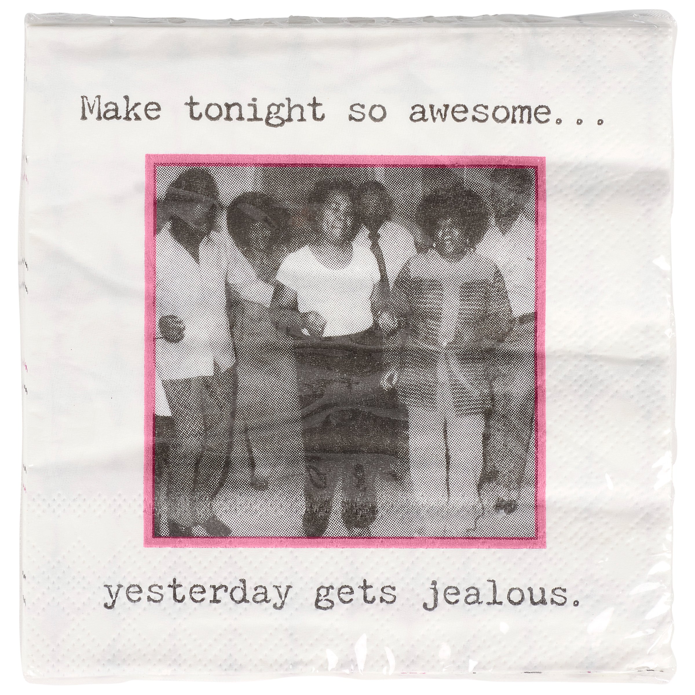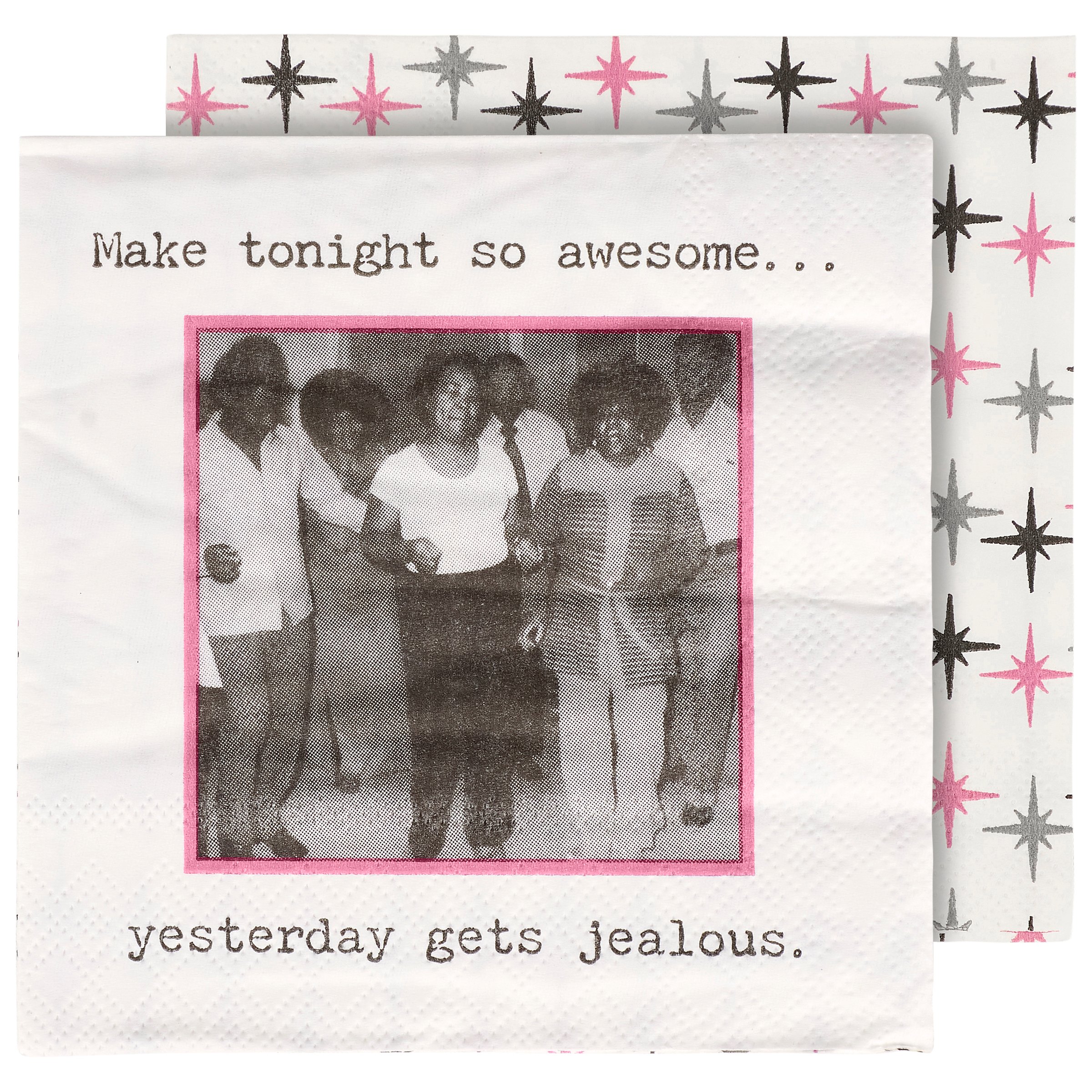 Perfect for entertaining guests and making clean-up a breeze, this disposable beverage napkin from our Trash Talk By Annie Collection displays a vintage black and white photograph complemented with a fun party themed sentiment that reads "Make Tonight So Awesome... Yesterday Gets Jealous." Beverage napkin also features a coordinating retro pattern on the back when flipped as well as the rest of the napkin when unfolded. Our Make Tonight So Awesome beverage napkin measures 5" by 5" and comes shrink-wrapped in a set of 20 napkins. A fun retro bar accessory perfect for everyday gatherings.