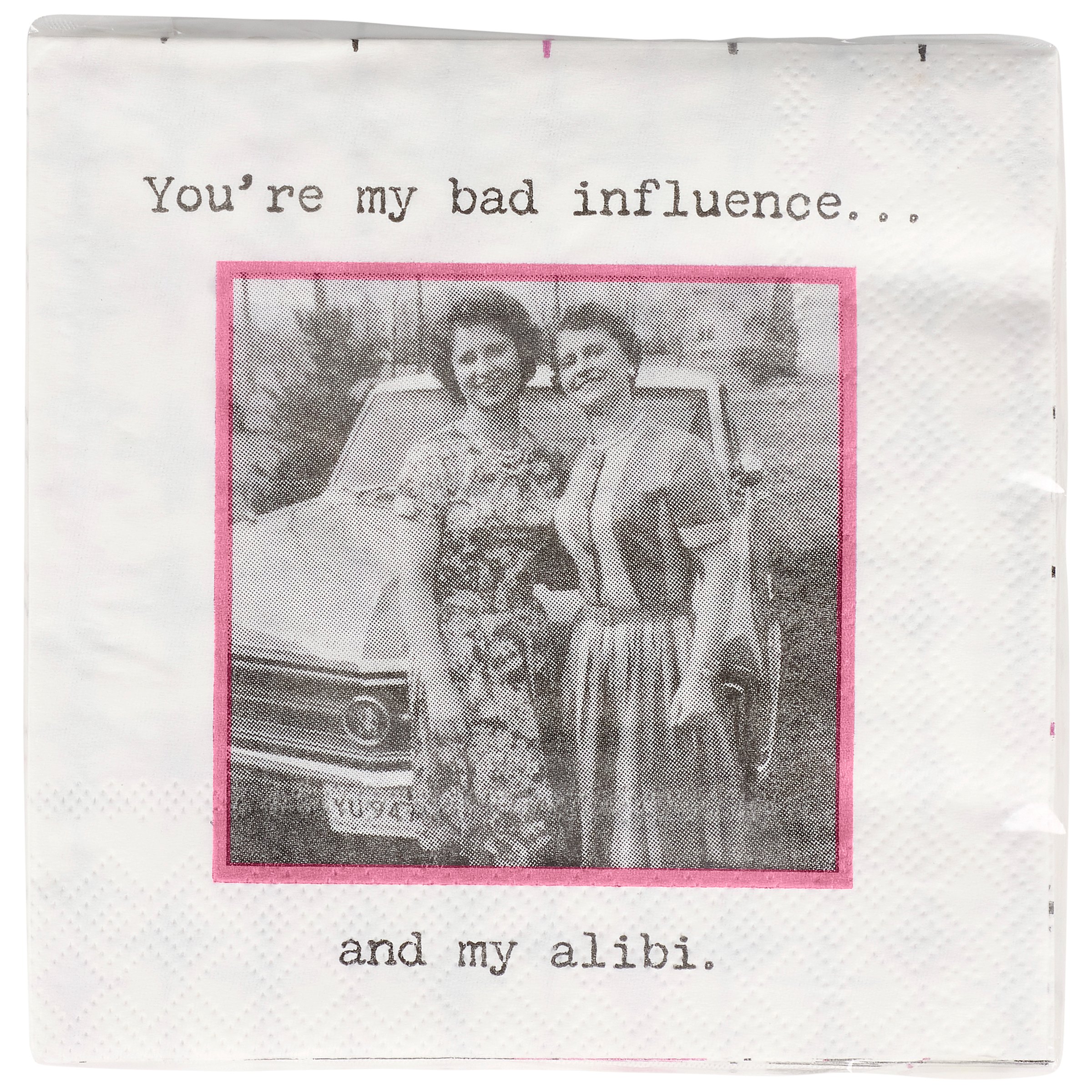 Perfect for entertaining guests and making clean-up a breeze, this disposable beverage napkin from our Trash Talk By Annie Collection displays a vintage black and white photograph complemented with a sassy friend themed sentiment that reads "You're My Bad Influence... And My Alibi." Beverage napkin also features a coordinating retro pattern on the back when flipped as well as the rest of the napkin when unfolded. Our My Bad Influence And My Alibi beverage napkin measures 5" by 5" and comes shrink-wrapped in a set of 20 napkins. A fun retro bar accessory perfect for everyday gatherings.