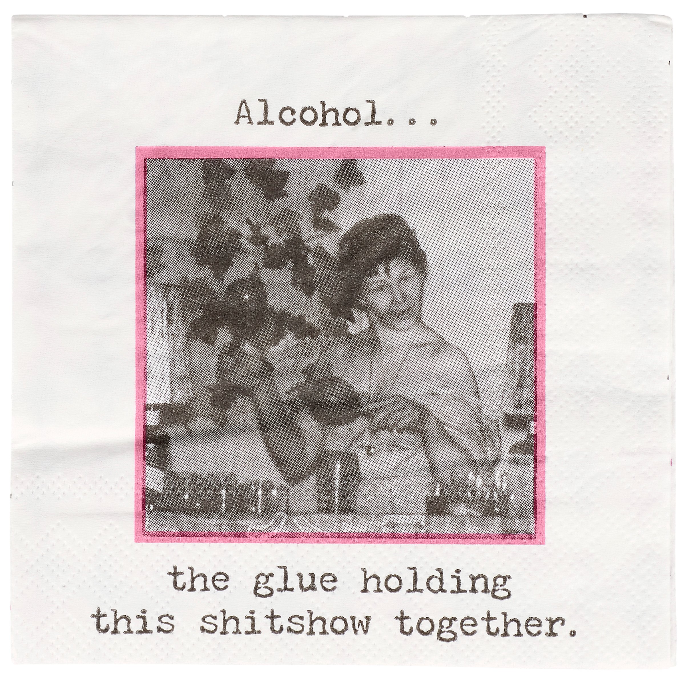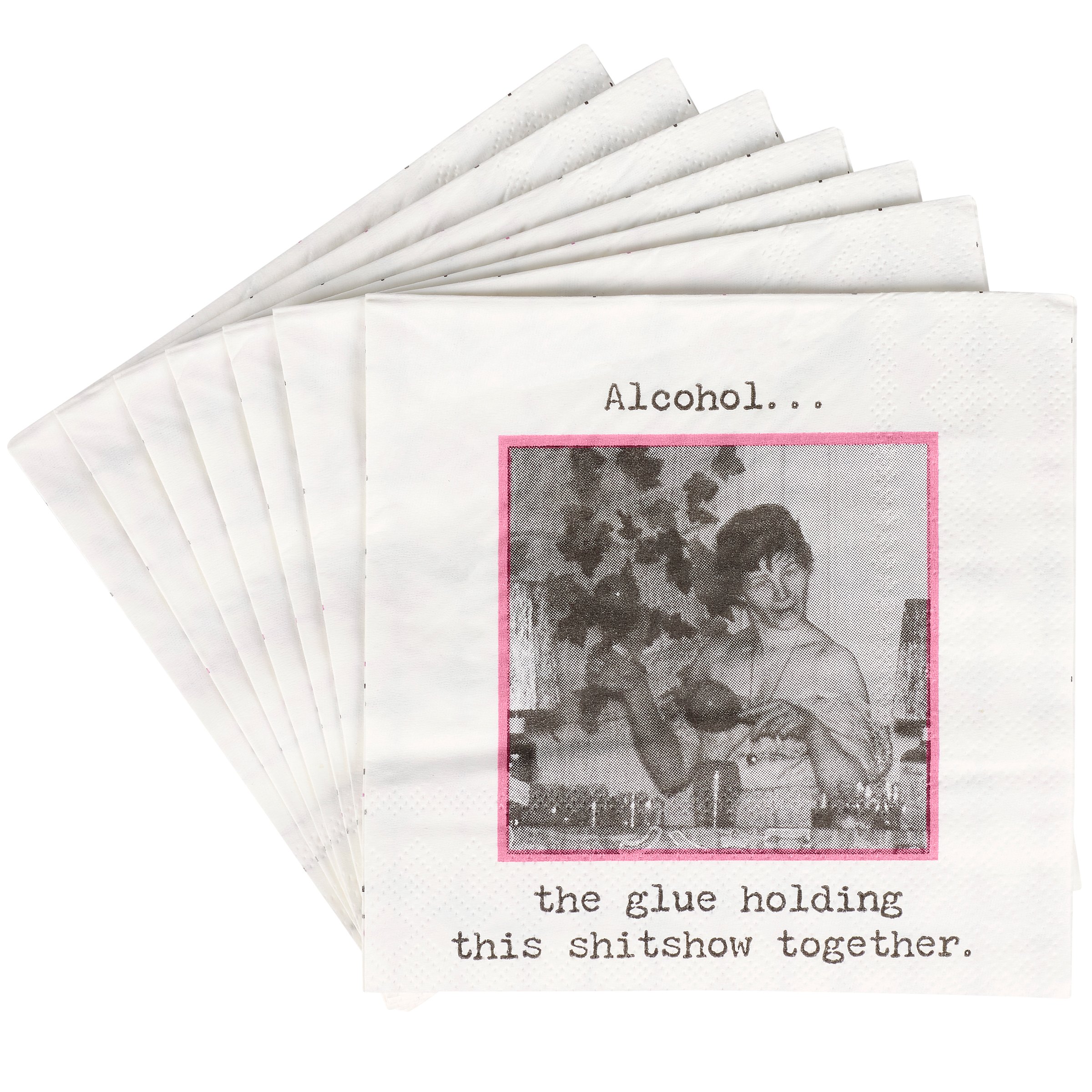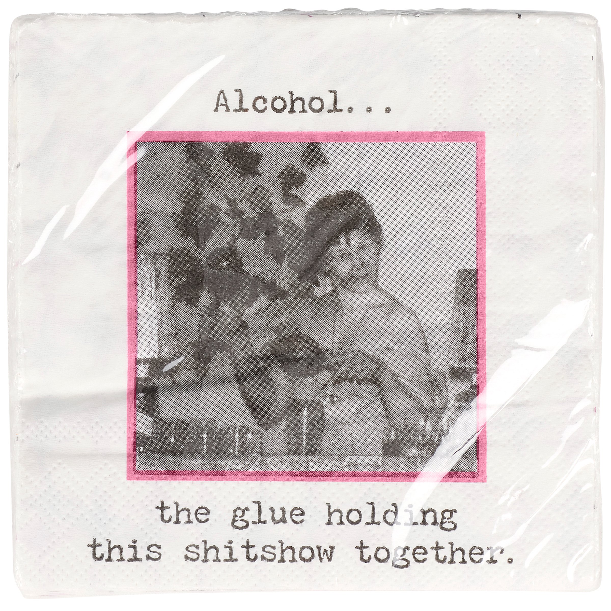 Perfect for entertaining guests and making clean-up a breeze, this disposable beverage napkin from our Trash Talk By Annie Collection displays a vintage black and white photograph complemented with a sassy alcohol themed sentiment that reads "Alcohol... The Glue Holding This Shitshow Together." Beverage napkin also features a coordinating retro pattern on the back when flipped as well as the rest of the napkin when unfolded. Our The Glue Holding This Together beverage napkin measures 5" by 5" and comes shrink-wrapped in a set of 20 napkins. A fun retro bar accessory perfect for everyday gatherings.