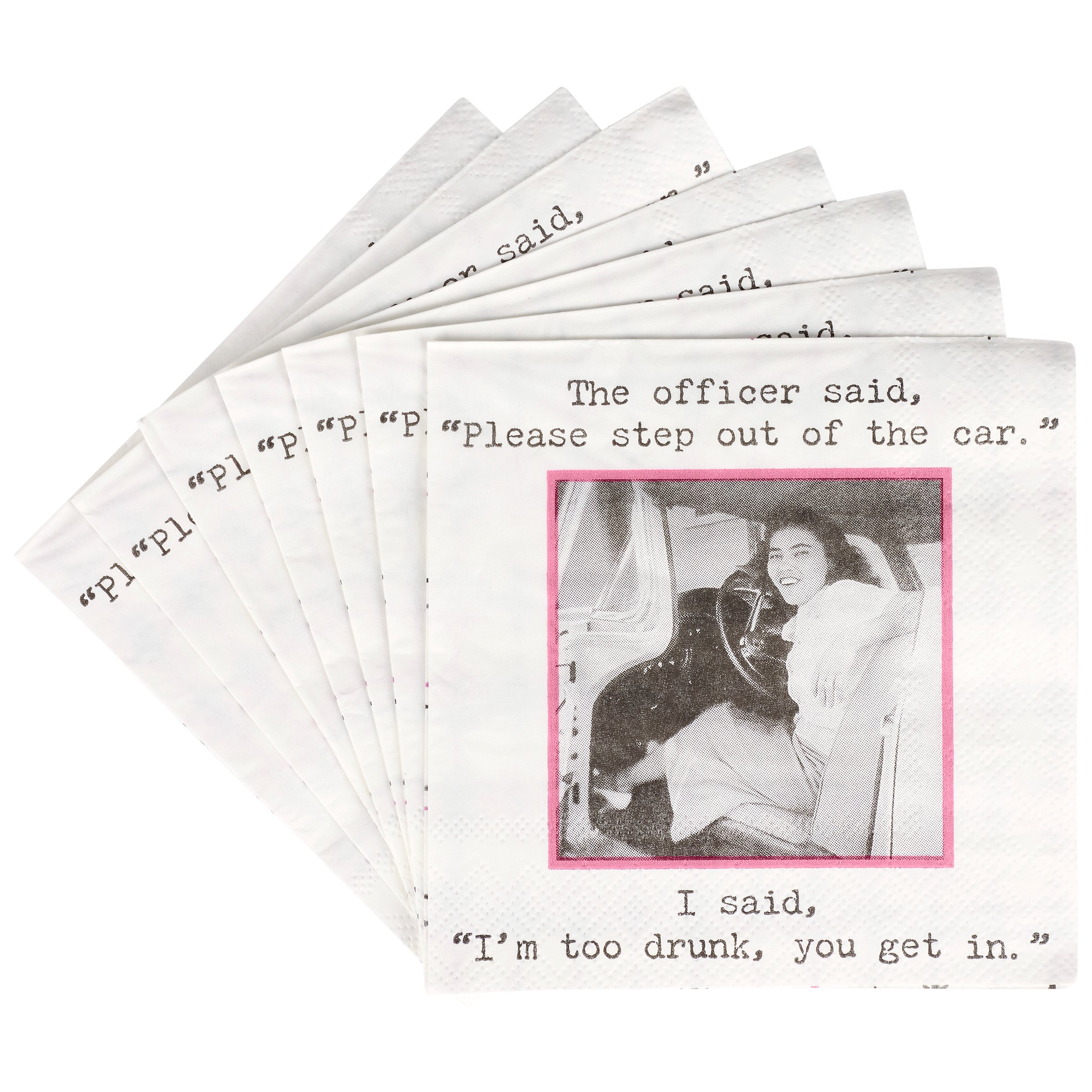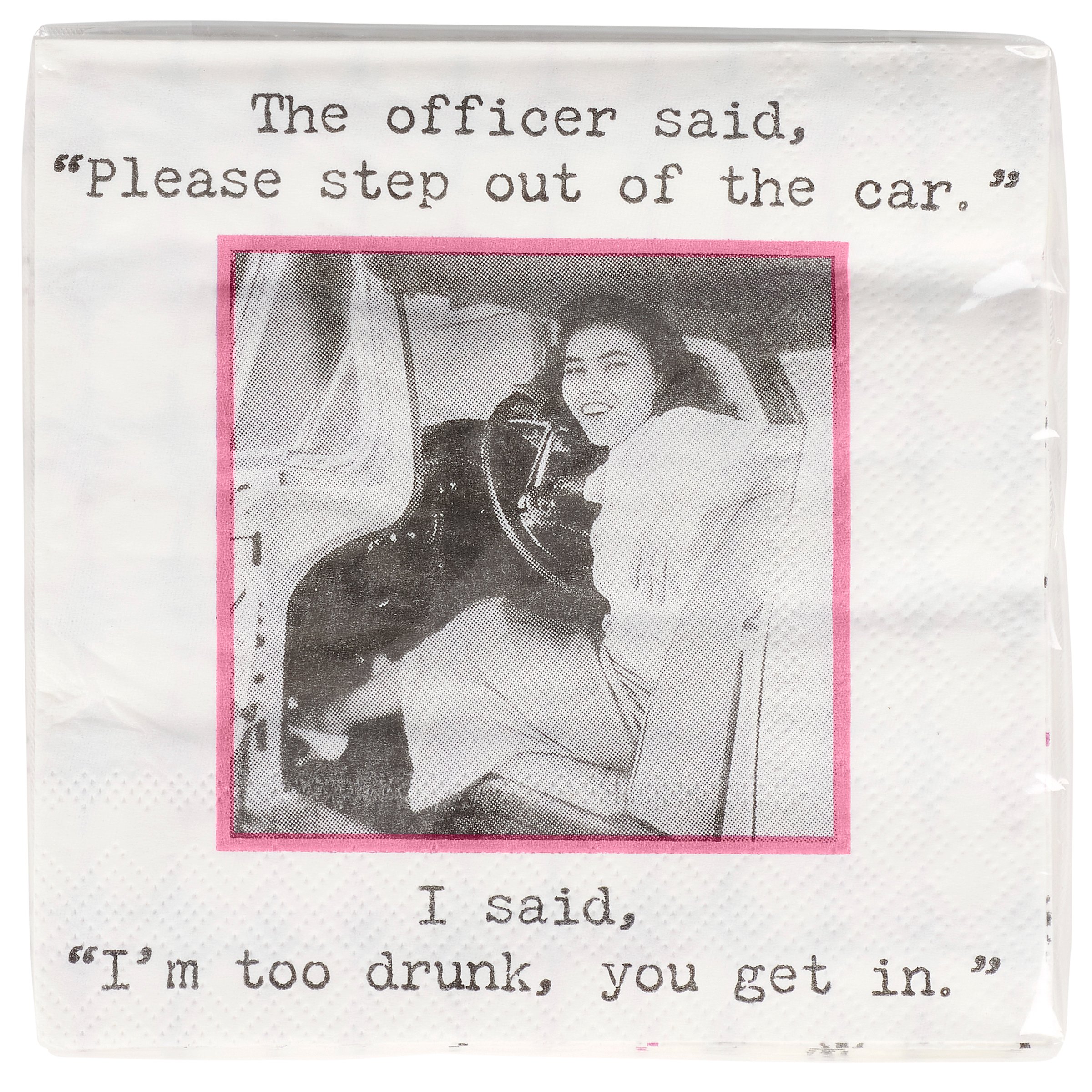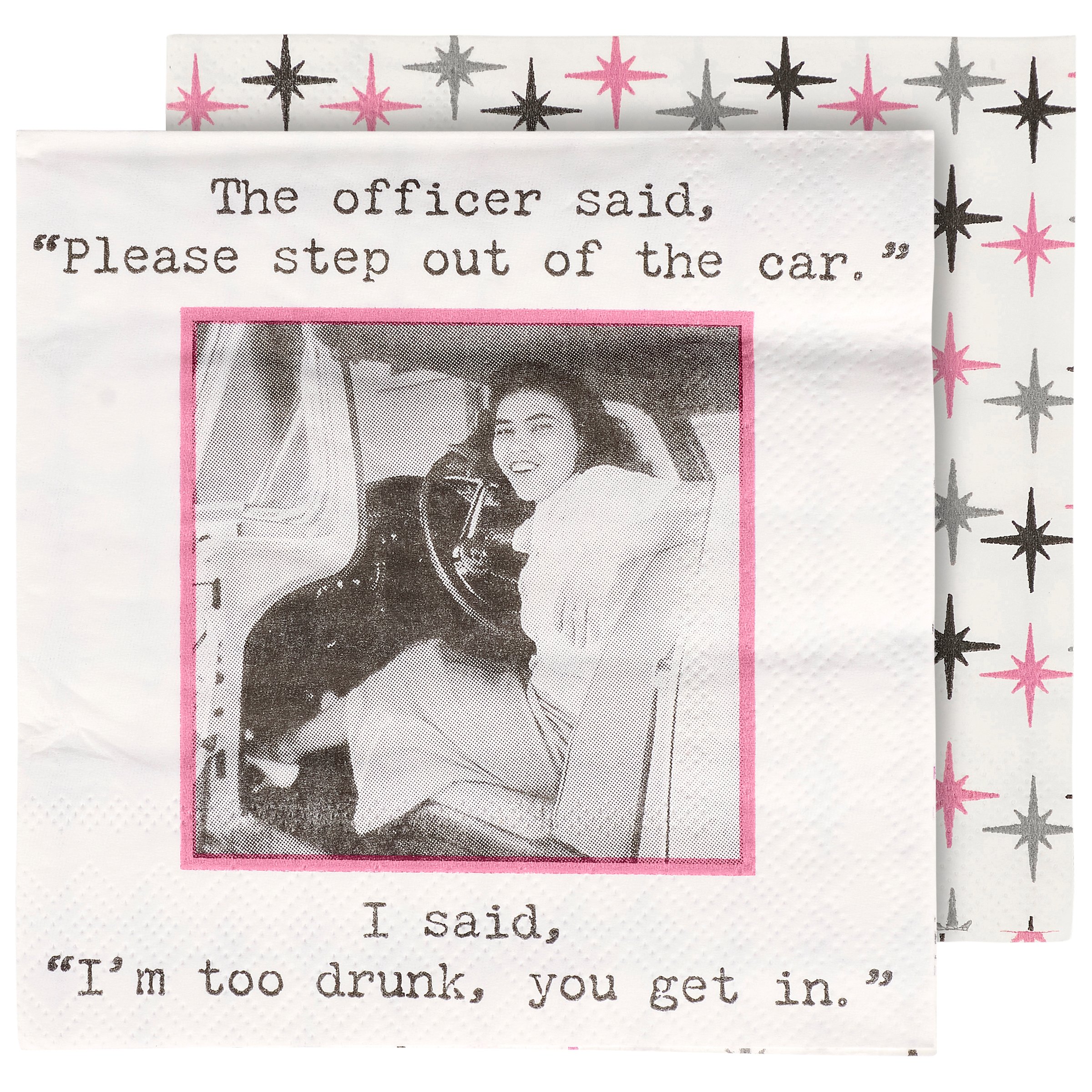 Perfect for entertaining guests and making clean-up a breeze, this disposable beverage napkin from our Trash Talk By Annie Collection displays a vintage black and white photograph complemented with a sassy alcohol themed sentiment that reads "The Officer Said, 'Please Step Out Of The Car.' I Said, 'I'm Too Drunk, You Get In.'" Beverage napkin also features a coordinating retro pattern on the back when flipped as well as the rest of the napkin when unfolded. Our The Officer Said I Said beverage napkin measures 5" by 5" and comes shrink-wrapped in a set of 20 napkins. A fun retro bar accessory perfect for everyday gatherings.