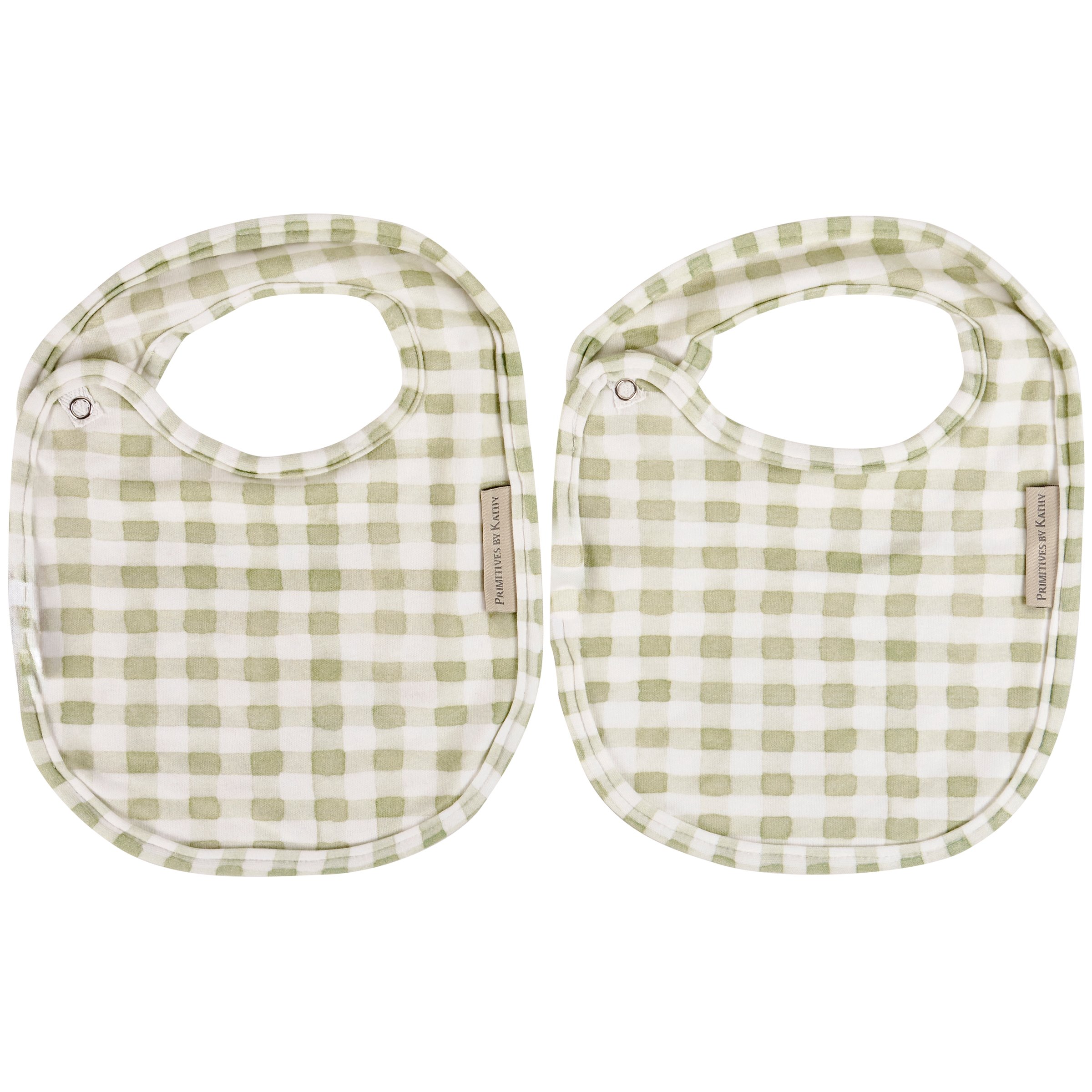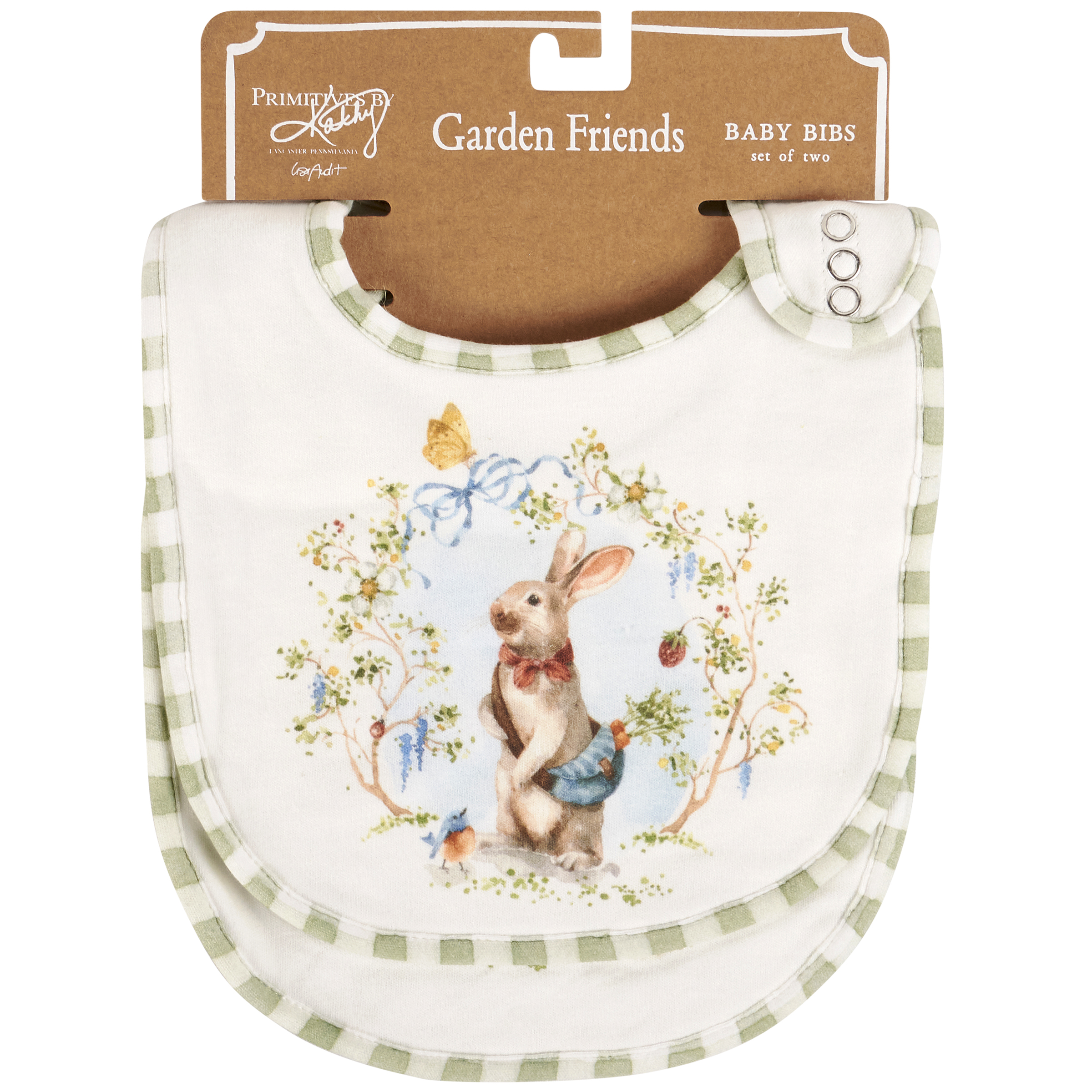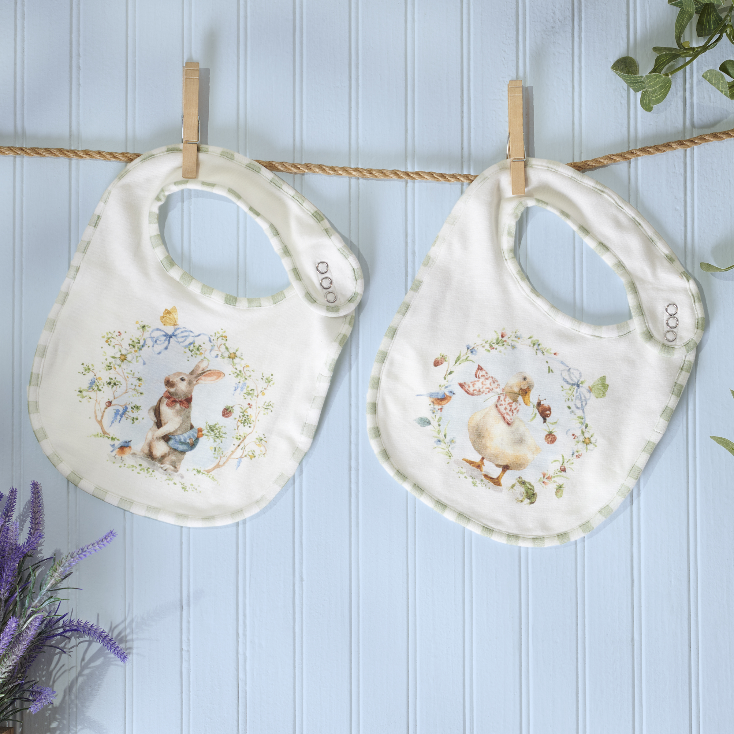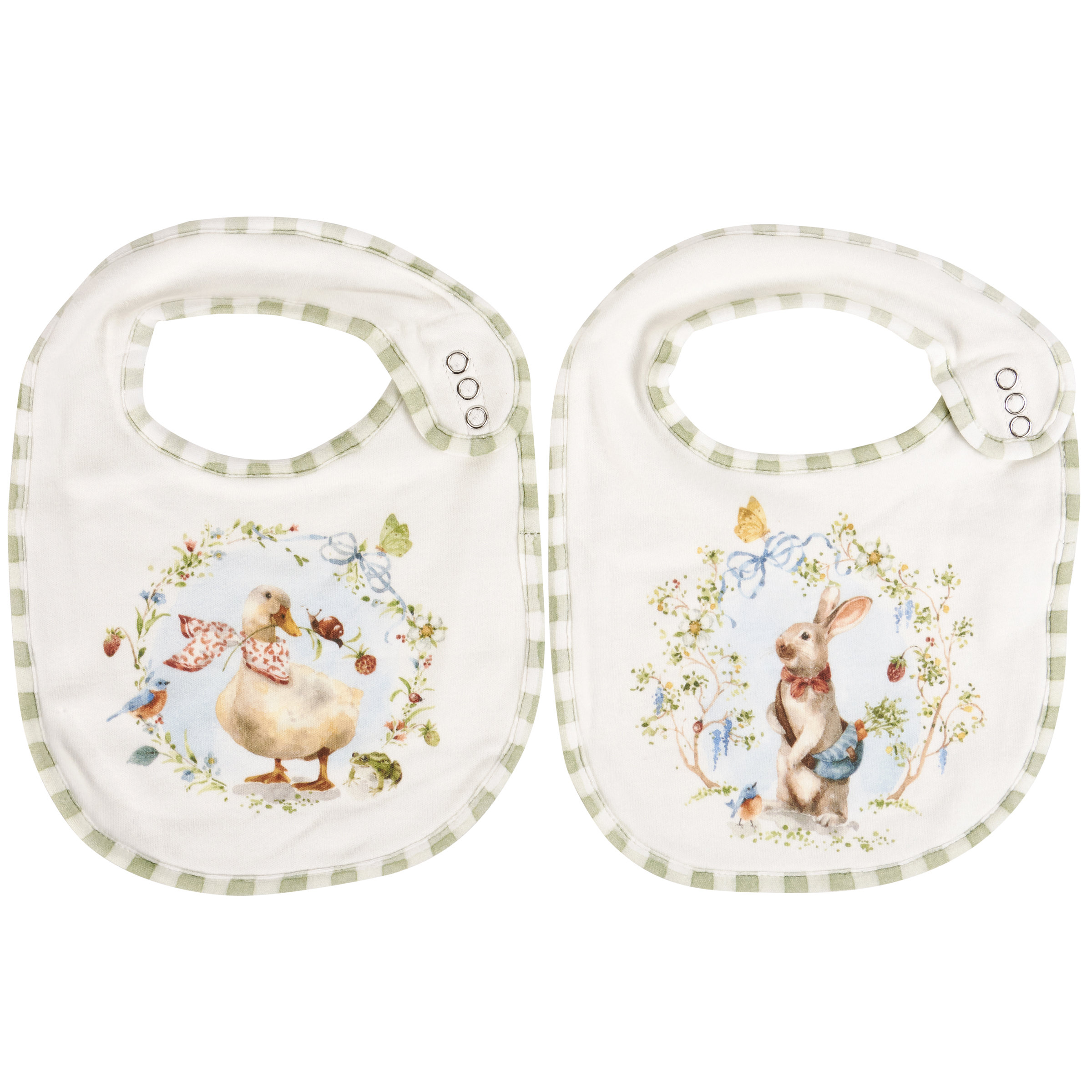 A set of two cotton bibs from our Baby & Kids Collection featuring charming storybook inspired designs on the front of each bib replicated from original art hand painted in a delicate watercolor style and coordinating gingham patterns on the back. Designs include a rabbit carrying a bag of carrots on one bib and a duck with a snail on the other. Cute garden bib set includes an adjustable metal snap closure and is conveniently machine-washable for easy cleaning. Our Garden Friend bibs are packaged on a single cardboard hanger to easily display and gift. A cute garden-themed gift set perfect for baby showers or everyday moments.
