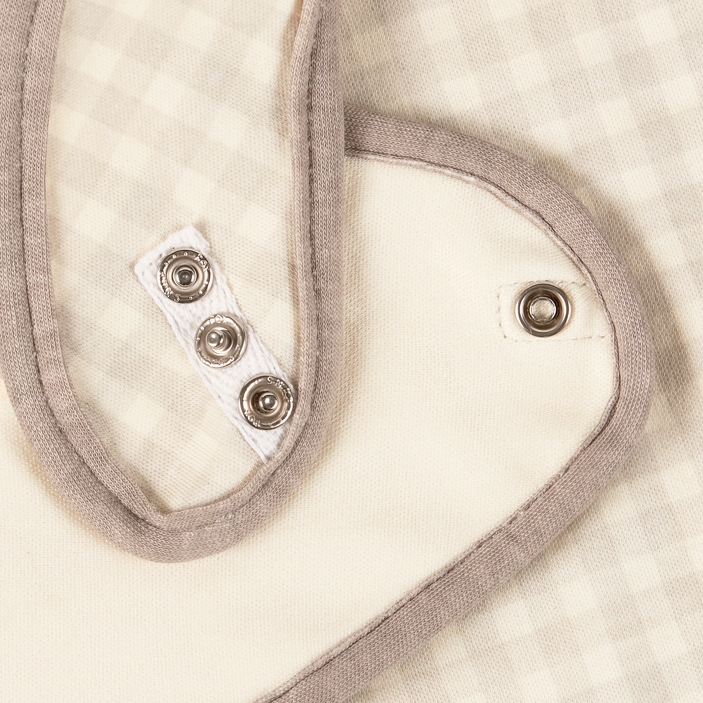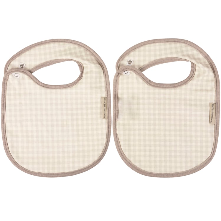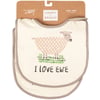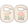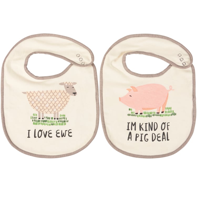 A set of two cotton bibs from our Baby & Kids Collection featuring charming farm animal themed designs on the front of each bib with coordinating gingham patterns on the back. Designs include a sheep with "I Love Ewe" sentiment on one bib and a pig with "I'm Kind Of A Pig Deal" sentiment on the other. Bib set includes an adjustable metal snap closure and is machine-washable for easy cleaning. Our I Love Ewe bib set is packaged on a single cardboard hanger to easily display. A cute farm themed gift set perfect for baby showers or everyday moments.