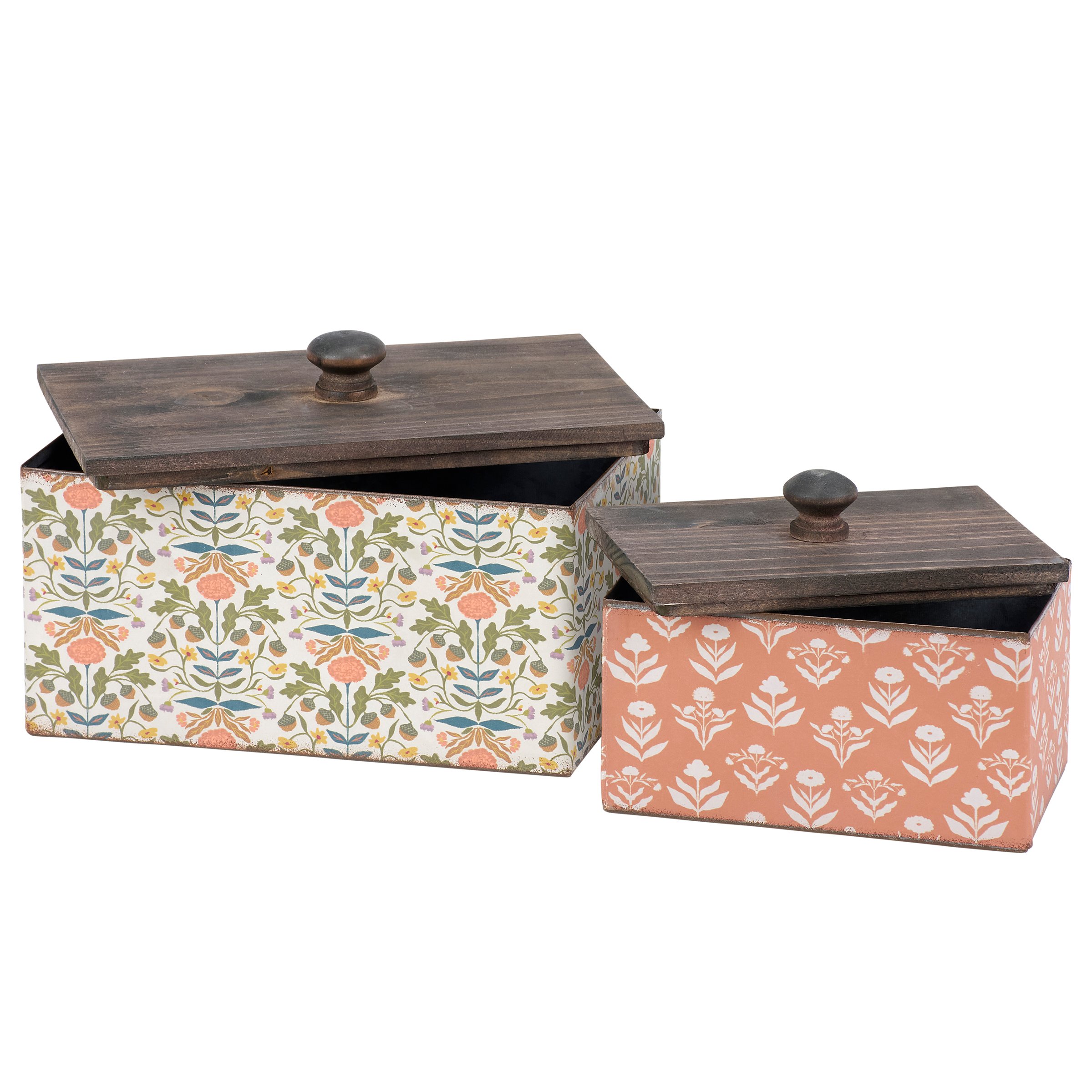 A galvanized metal bin set from our Fall Collection including two different sized rectangular bins with natural wood lids that can nest within each other for easy storage. Each bin features full wrap-around designs displaying folk art inspired patterns of elegant fall florals. Large bin displays colorful fall florals with the small bin displaying a two color pattern of fall floral silhouettes. Our Fall Folk Floral bins are perfect for organizing household items while decorating for fall or everyday folk art style. A set of folk art fall home accents with a variety of seasonal display options.