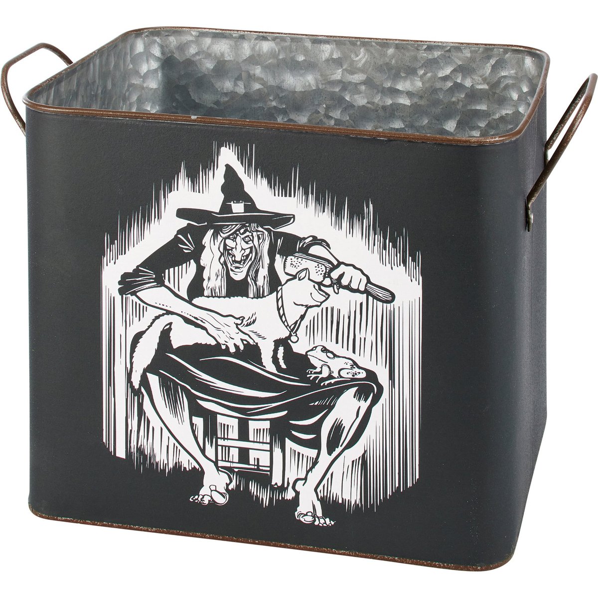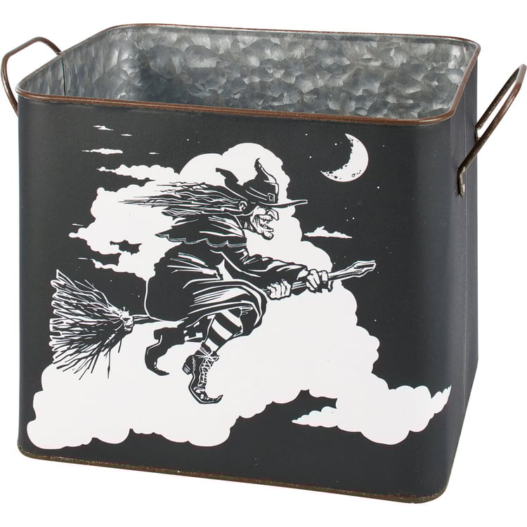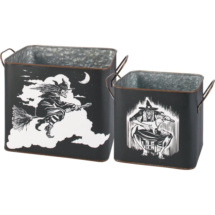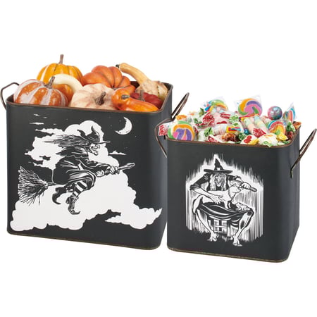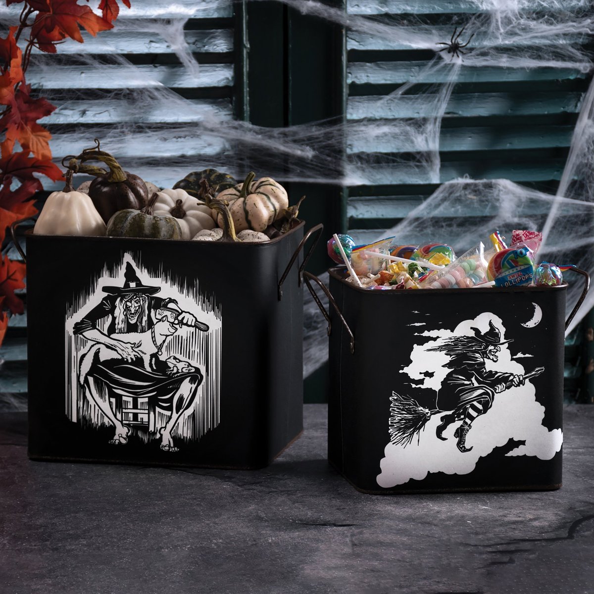 A set of two metal bins from our Halloween Collection featuring hand illustrated scenes of witches in a bold black and white style. Large bin displays a witch flying on a broom with small bin displaying a witch grooming a cat. Our Flying Witch And Cat bin set includes dual side metal handles for easy carrying and stack inside each other for storage. Decorative use only; not food safe. Accessories pictured not included. A fun seasonal home accent with a variety of display options.