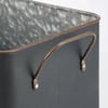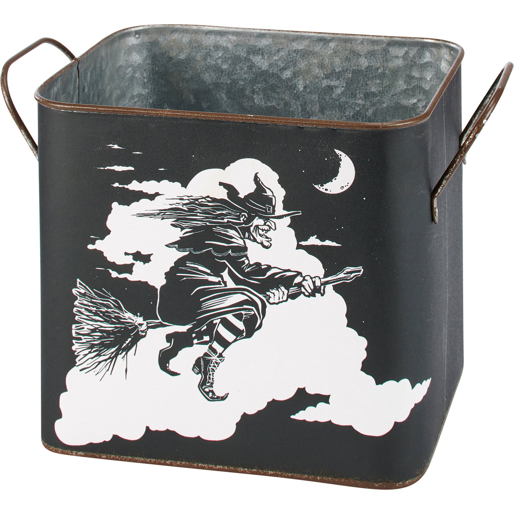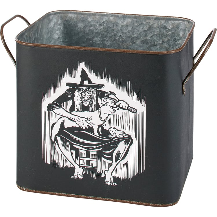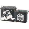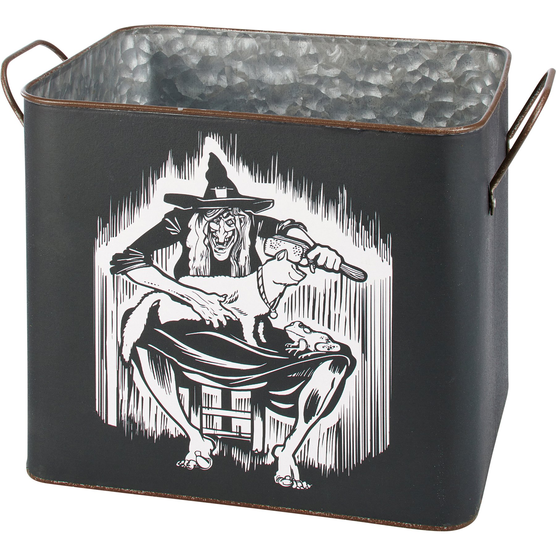 A set of two metal bins from our Halloween Collection featuring hand illustrated scenes of witches in a bold black and white style. Large bin displays a witch flying on a broom with small bin displaying a witch grooming a cat. Our Flying Witch And Cat bin set includes dual side metal handles for easy carrying and stack inside each other for storage. Decorative use only; not food safe. Accessories pictured not included. A fun seasonal home accent with a variety of display options.