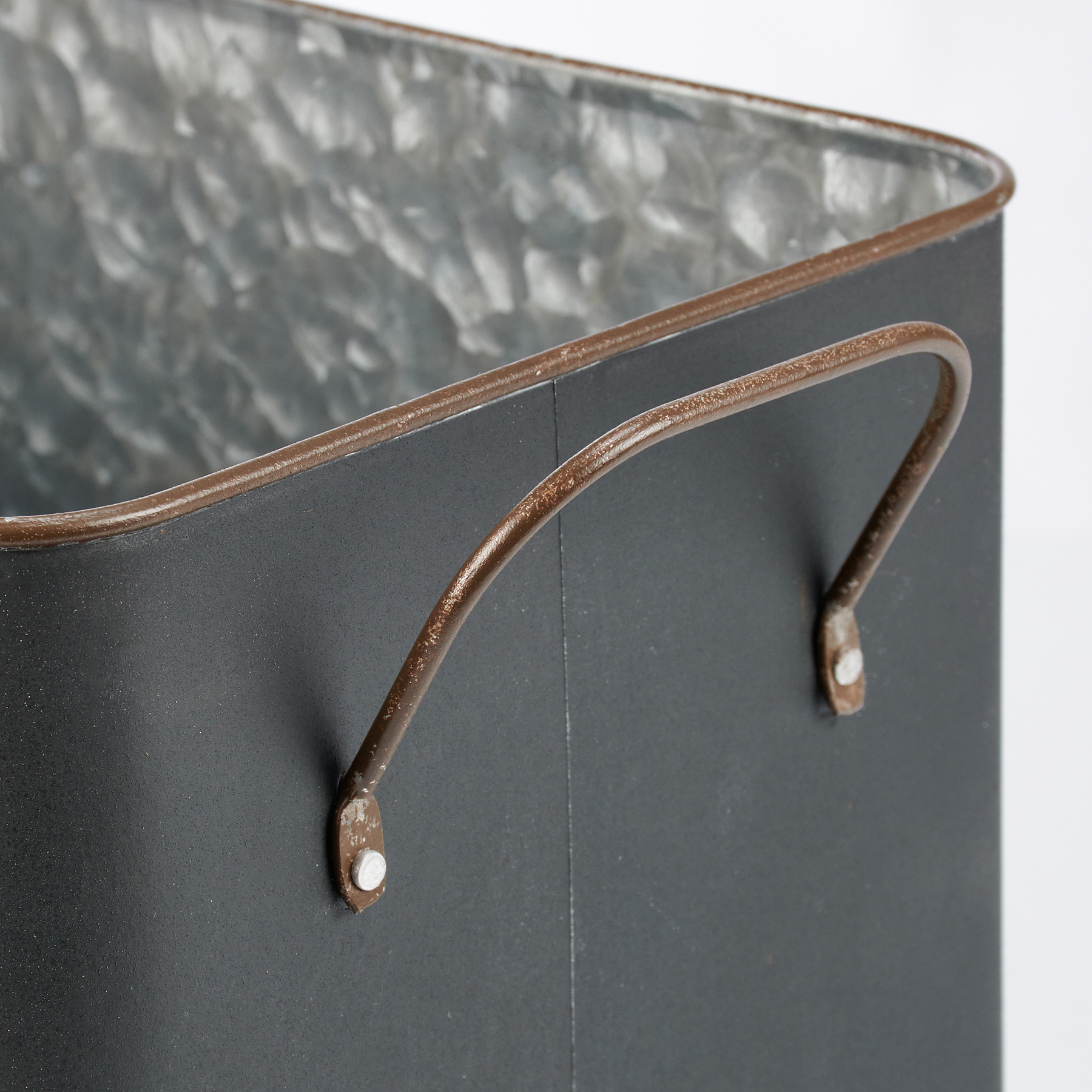 A set of two metal bins from our Halloween Collection featuring hand illustrated scenes of witches in a bold black and white style. Large bin displays a witch flying on a broom with small bin displaying a witch grooming a cat. Our Flying Witch And Cat bin set includes dual side metal handles for easy carrying and stack inside each other for storage. Decorative use only; not food safe. Accessories pictured not included. A fun seasonal home accent with a variety of display options.