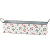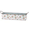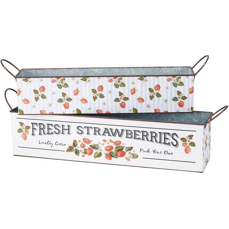 A galvanized metal bin set from our Garden Collection including two different sized rectangular bins with metal handles on the sides that can nest within each other for easy storage. Each bin displays strawberry themed designs replicated from original art hand painted in a unique watercolor style. Larger bin displays a "Fresh Strawberries - Locally Grown Pick Your Own" sentiment with wild strawberry designs. Smaller bin displays a wrap-around design of strawberries and flowers on a complementing stripe pattern. Our Fresh Strawberries bin set is for decorative use only and is not food safe. Greenery and accessories pictured not included. A rustic everyday home accent with a variety of display options.