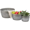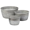 A set of three galvanized metal bins in different sizes from our Western Collection featuring embossed patterns throughout to create a southwestern style. Southwestern bin set is perfect for holding small household objects or faux greenery. Accessories and greenery pictured not included. Metal bins nest inside each other for easy storage. Our Galvanized bins are a stylish western inspired home accent with a variety of display options.