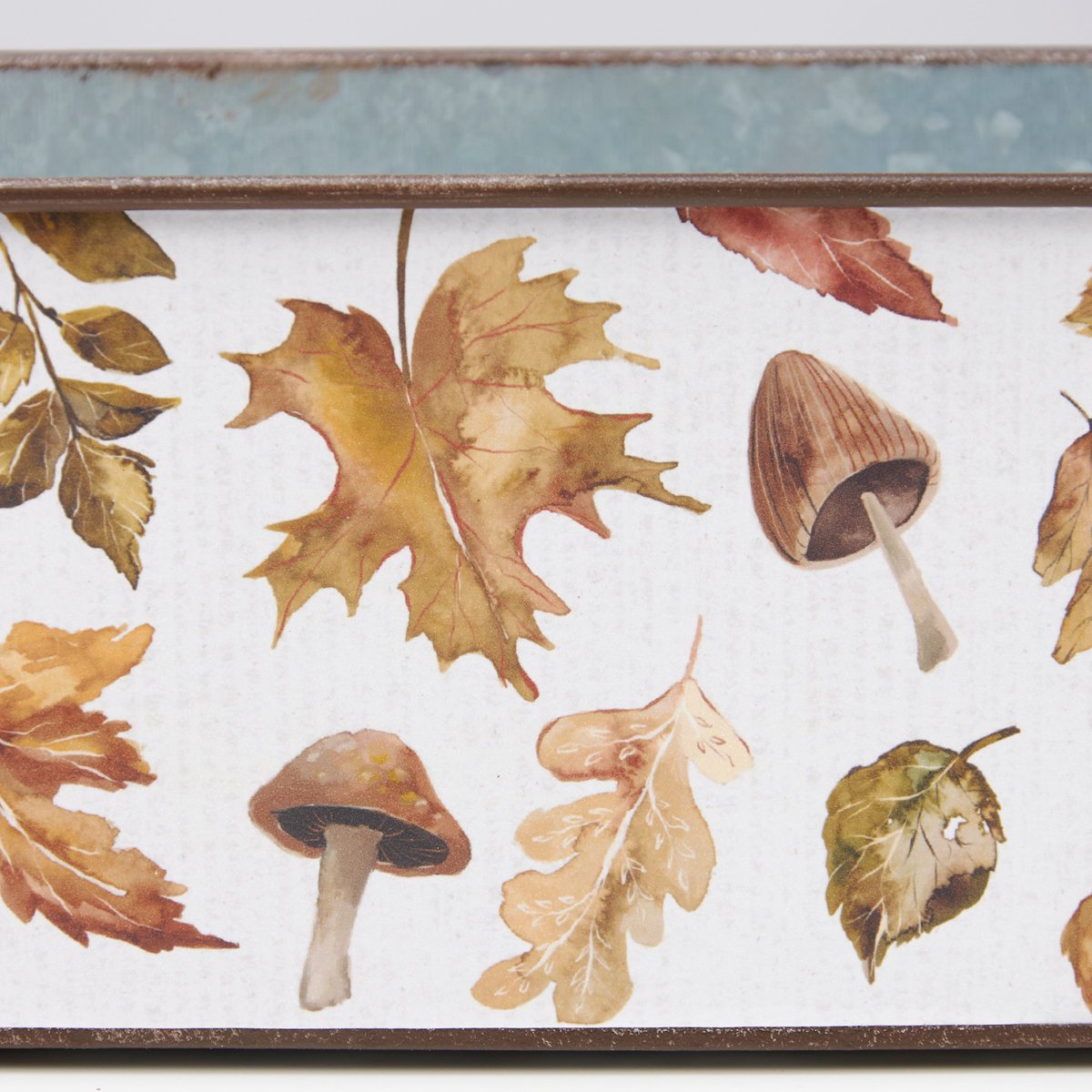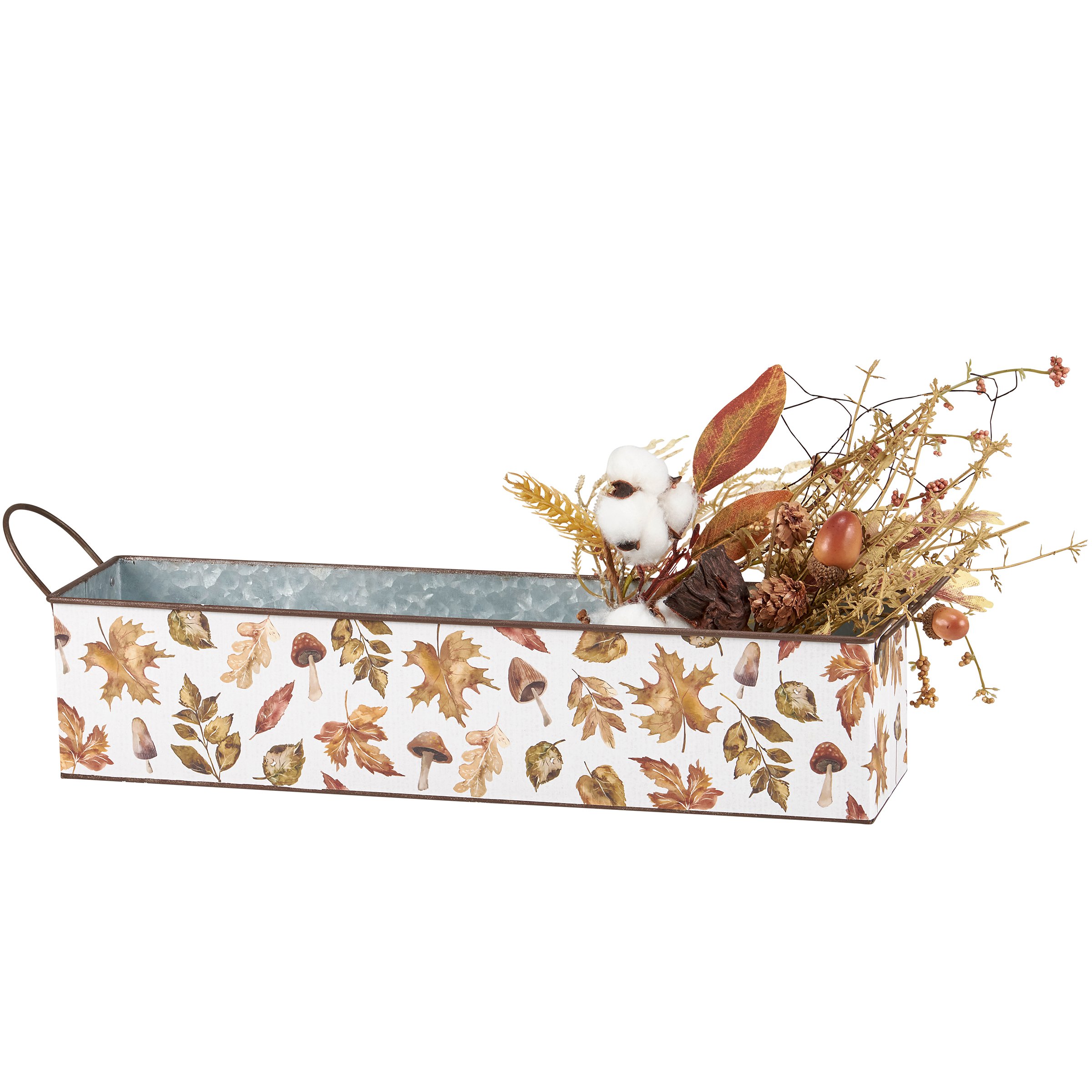 A galvanized metal bin set from our Fall & Harvest Collection including two different sized rectangular bins with metal handles on the sides that can nest within each other for easy storage. Each bin displays hand painted fall themed designs in a watercolor style. Larger bin displays a wrap-around design of mushrooms, autumn leaves, and pumpkins with "Family Is One Of Life's Greatest Blessings" sentiment on the front. Smaller bin displays an all-over design of autumn leaves and mushrooms. Our Greatest Blessings bin set is for decorative use only and is not food safe. Greenery shown not included. A rustic seasonal home accent with a variety of display options.