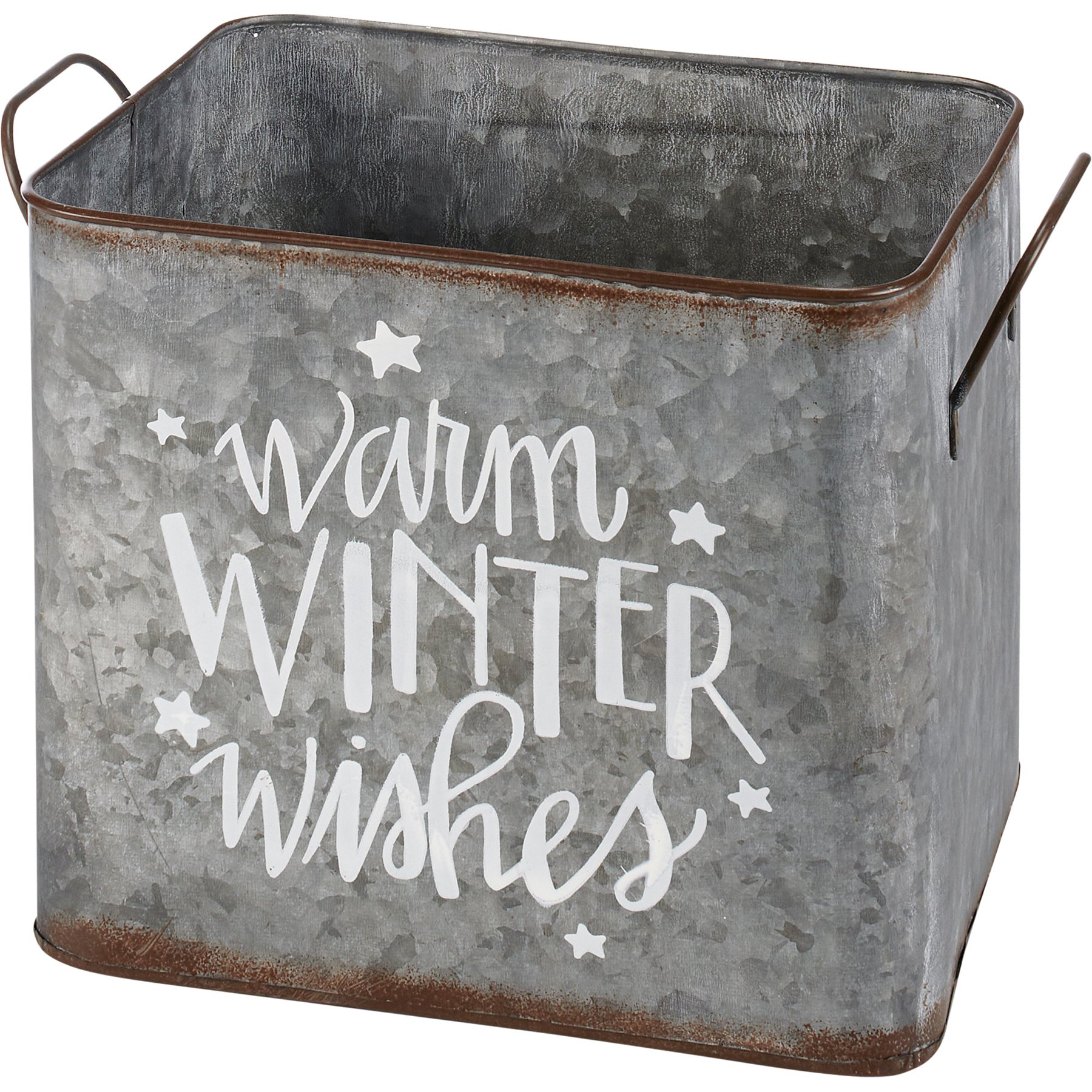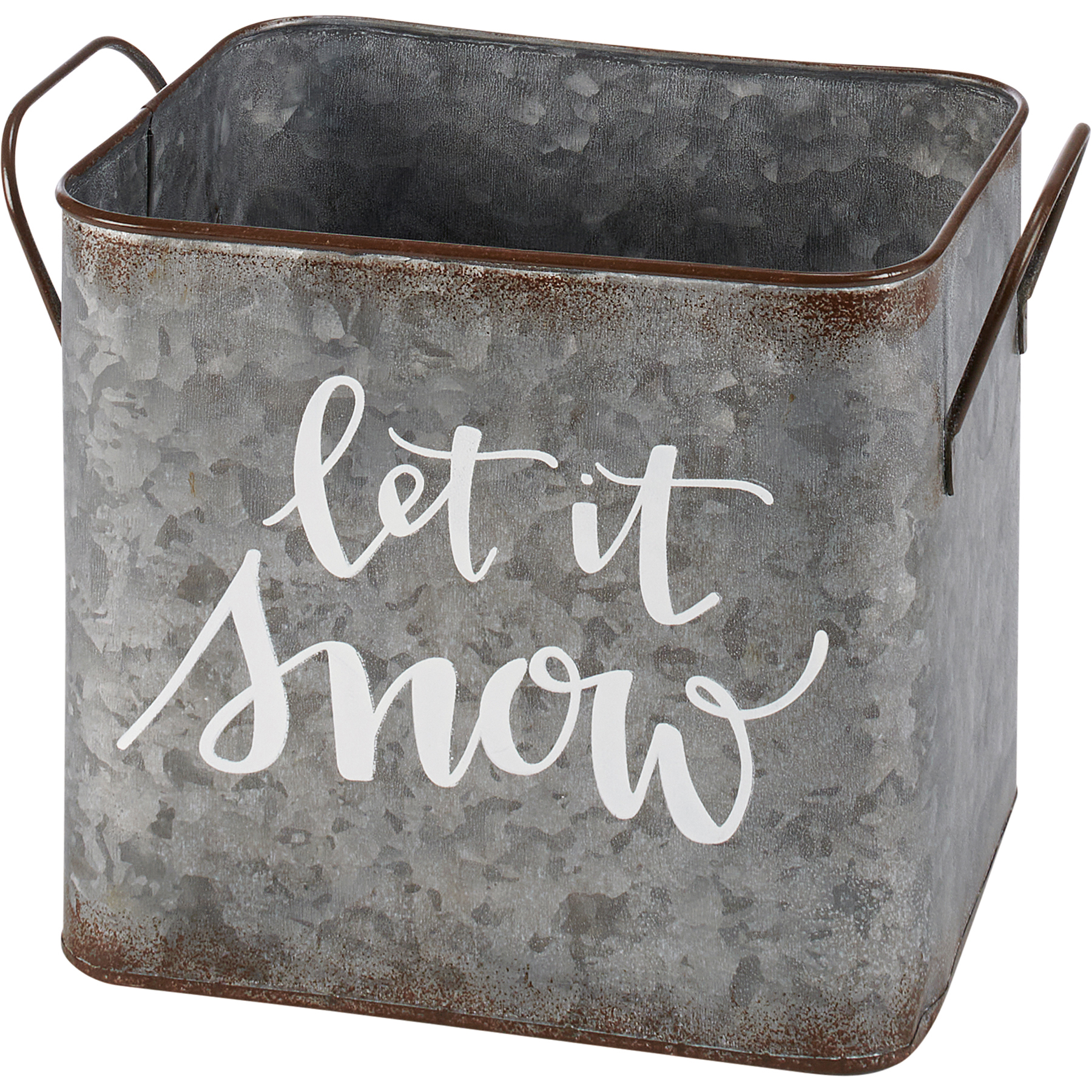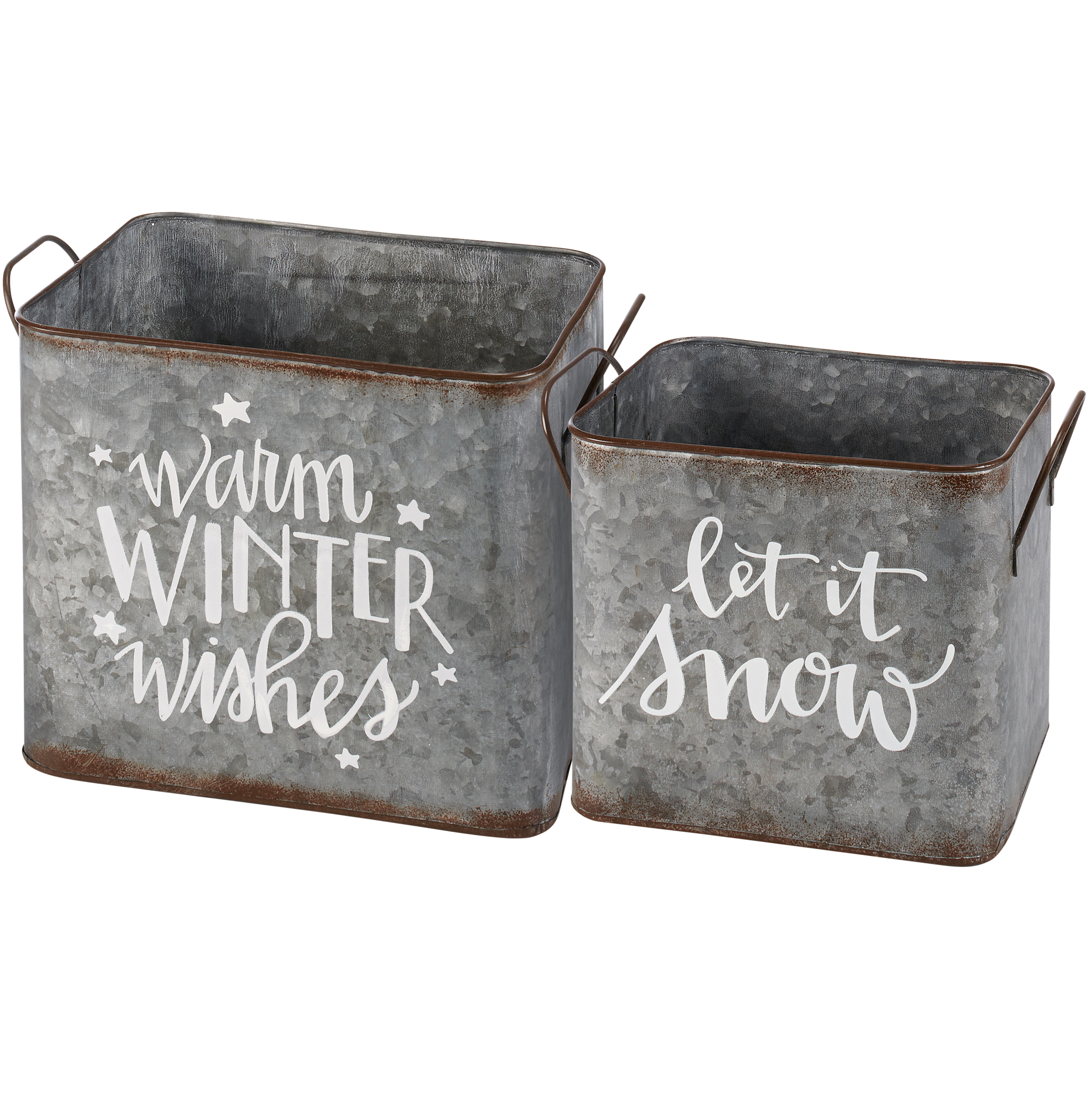 A set of two metal bins of varying sizes with hand lettered "Warm Winter Wishes" and "Let It Snow" sentiments and textured coating for snowy effect. Contains dual side handles.