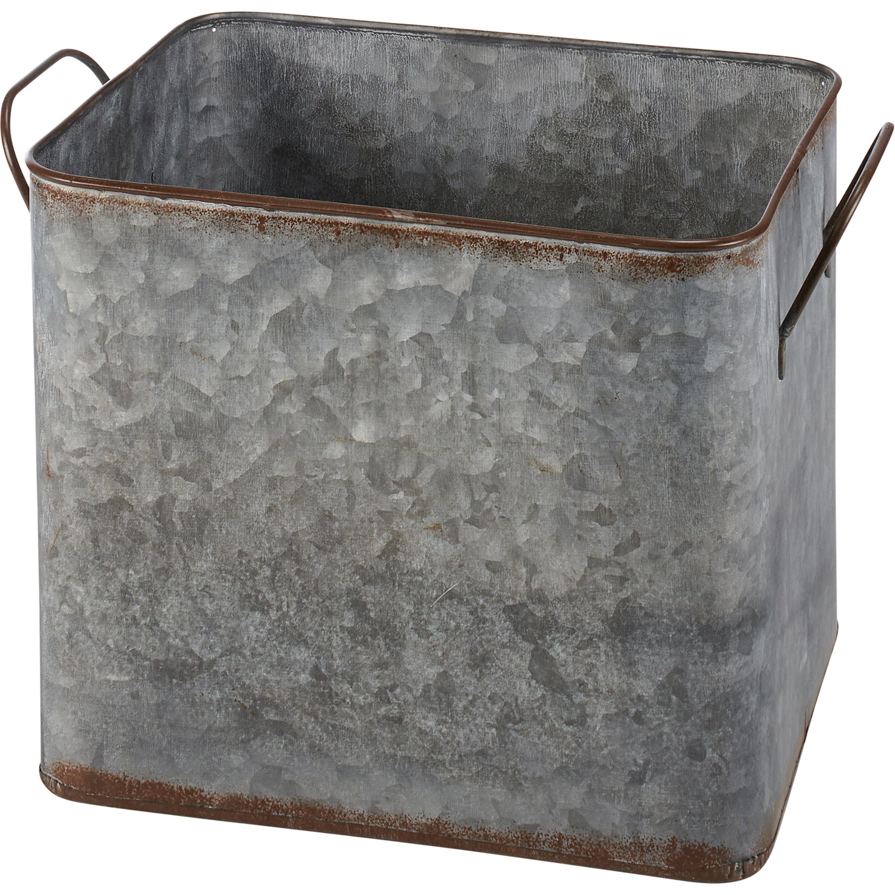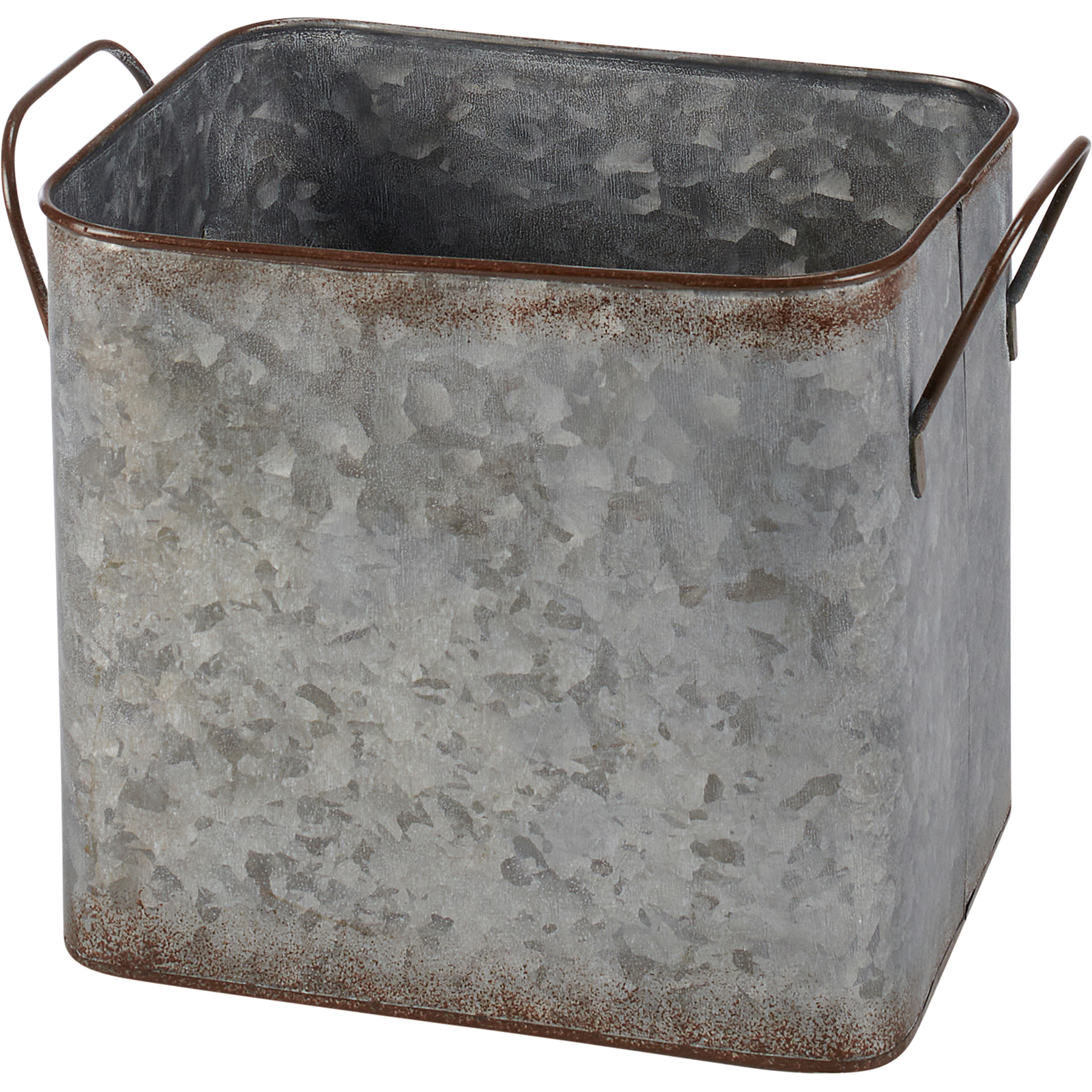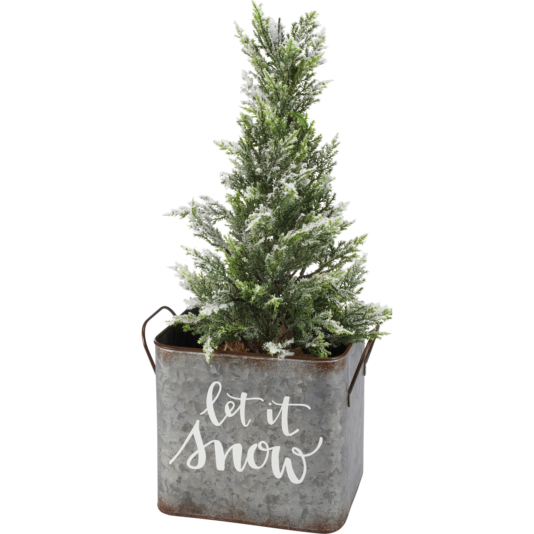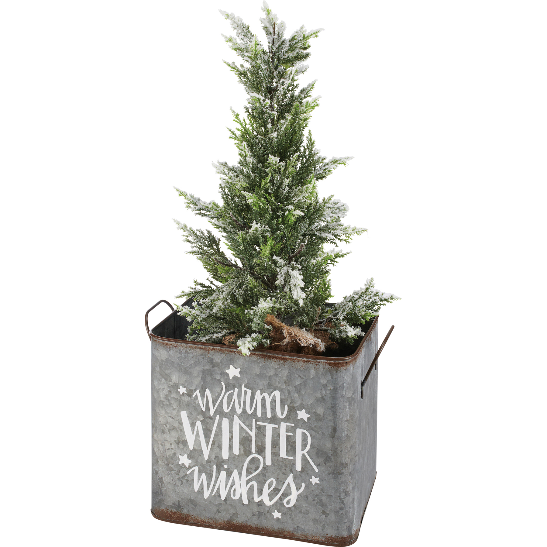 A set of two metal bins of varying sizes with hand lettered "Warm Winter Wishes" and "Let It Snow" sentiments and textured coating for snowy effect. Contains dual side handles.