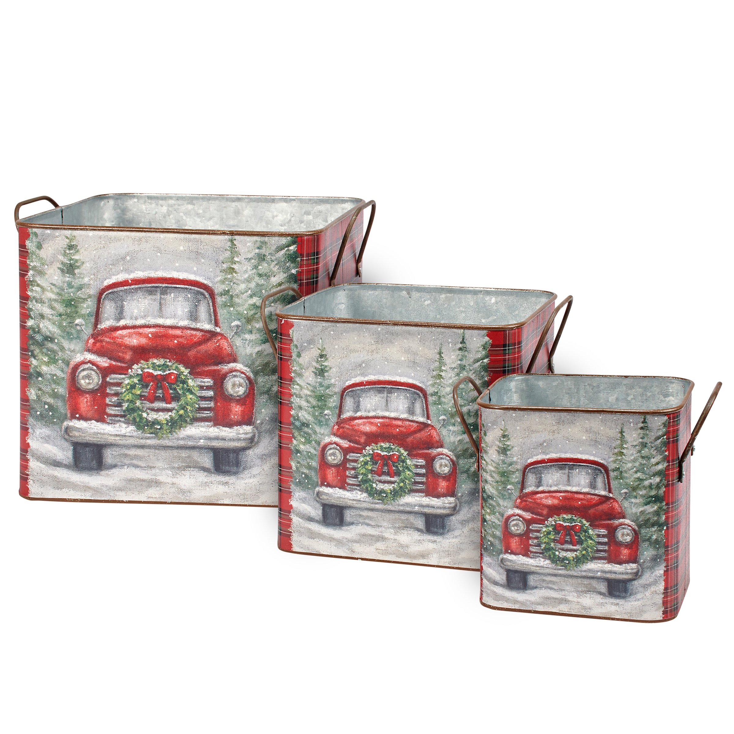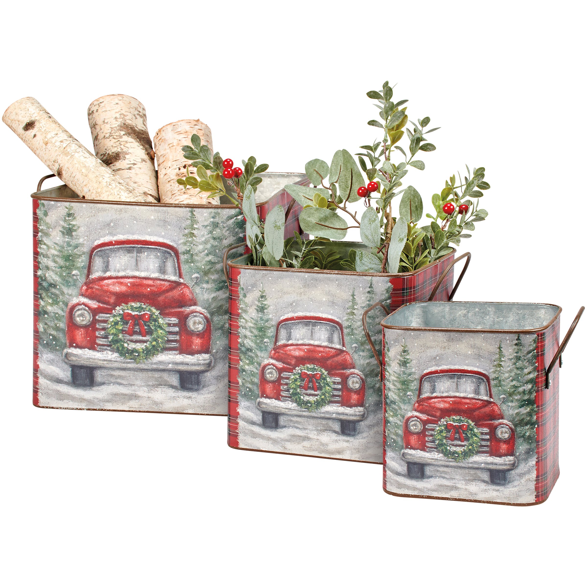 A set of 3 galvanized metal bins from our Christmas Collection displaying a charming hand painted winter scene of a classic red pickup truck and holiday wreath with complementing Christmas tartan plaid on the sides. Double-sided designs are replicated from original artwork painted onto burlap canvas, giving the art a unique depth and texture. Seasonal bin set is perfect for holding small household objects or winter greenery and accents. Greenery pictured not included. Our Red Truck bin set includes dual side metal handles for easy carrying and nest inside each other for compact storage. A set of rustic home accents with a variety of seasonal display options.