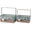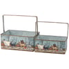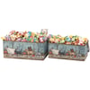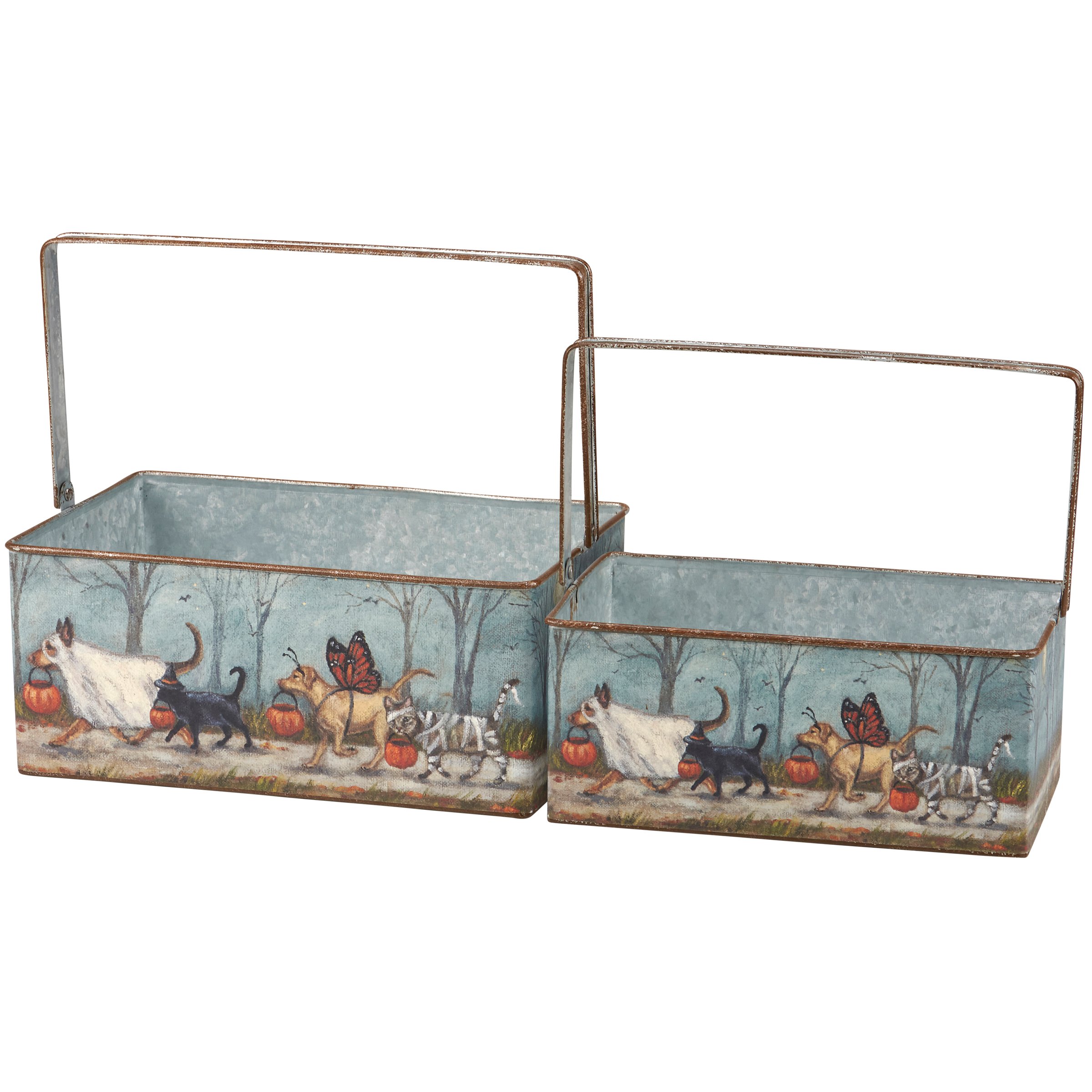 A set of two galvanized metal bins from our Halloween Collection featuring a full-wrap around design on each displaying trick or treating cats and dogs walking together in Halloween costumes. Design is replicated from original artwork painted onto burlap canvas, giving the art a unique depth and texture. Seasonal bin set is perfect for holding seasonal décor or Halloween treats. Accessories pictured not included. Our Spooky Pet Parade bin set includes metal handles for easy carrying and nest inside each other for compact storage. A charming set of seasonal home accents with a variety of display options.