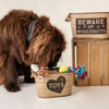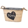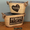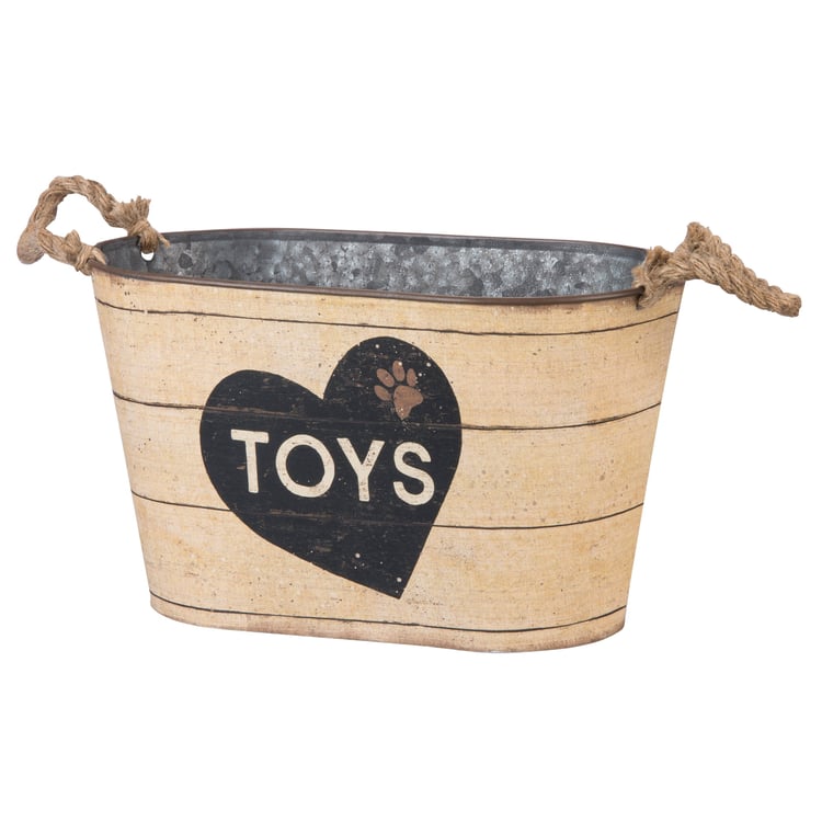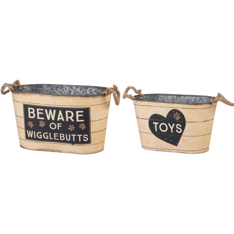 A set of two tin bins of varying sizes with slatted wood printed background. Small bin lends "Toys" sentiment with heart and paw print design; medium bin lends "Beware Of Wigglebutts" sentiment with paw print designs. Complements well with coordinating design pieces and great for organizing!