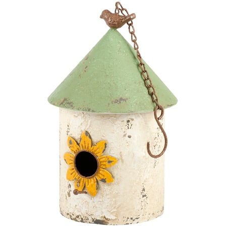 A decorative birdhouse from our Garden Collection displaying a cute hut design featuring sunflower petal cutouts around the opening and a small sculpted metal bird on top. Sunflower birdhouse body features painted metal pieces with distressed details for an aged appearance as well as a metal peg under the opening. Our Sunflower Hut birdhouse is ready to hang for display using the attached chain and metal hook hanger or can free stand on flat surface. A rustic sunflower themed home accent perfect for indoor or outdoor display.