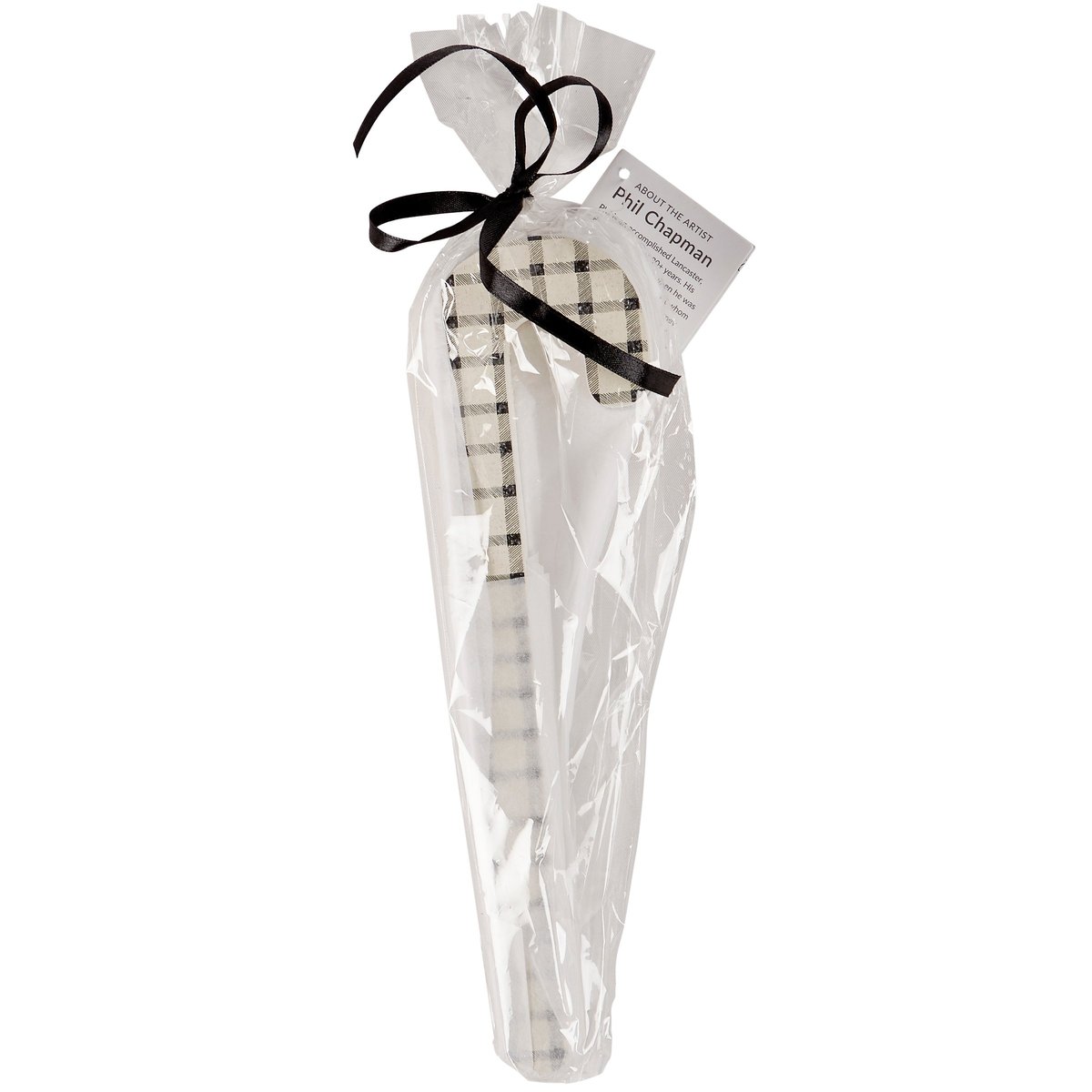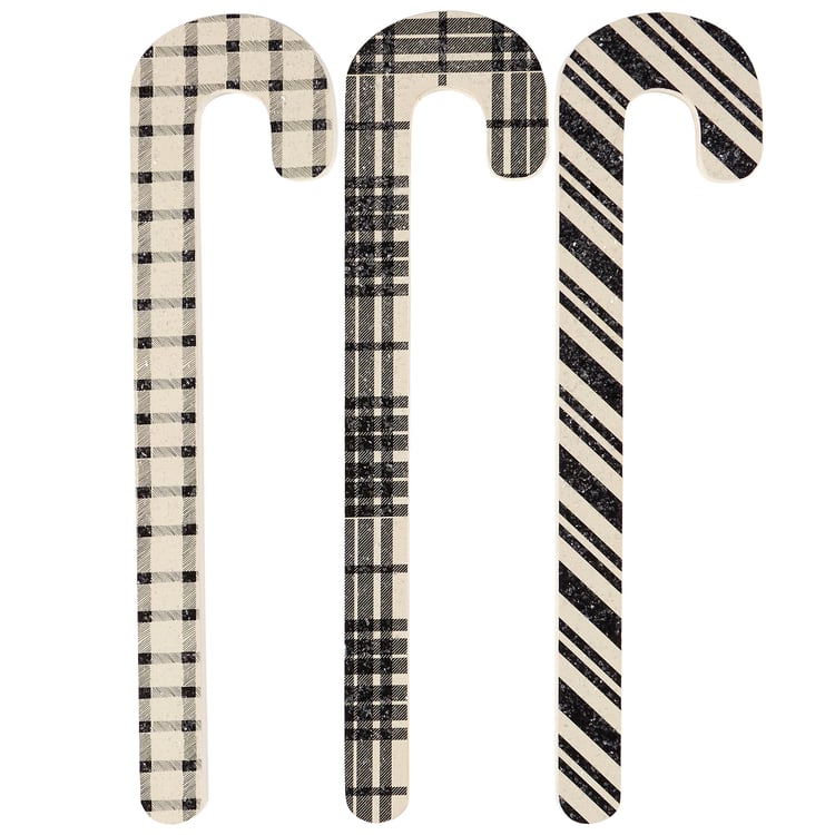 A set of 3 decorative candy canes from our Christmas Collection displaying various black and white plaid inspired designs on natural wood with mica coating for a frosty appearance. Our Black Plaid Candy Cane set is packaged together in a poly bag tied with black ribbon. A set of rustic home accents with a variety of seasonal display options.