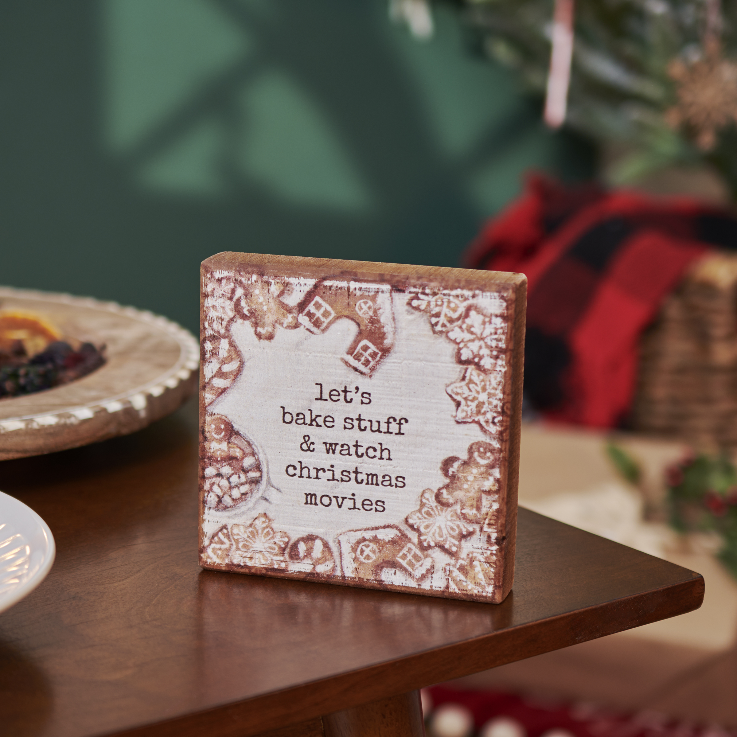 A wooden block sign from our Christmas Collection displaying various gingerbread cookies accenting a fun Christmas-themed sentiment that reads "Let's Bake Stuff & Watch Christmas Movies." Design is replicated from original artwork painted onto burlap canvas, giving the art a unique depth and texture. Seasonal block sign features distressed details with coordinating natural wood on the sides and back. Our Bake Stuff sign is easy to hang via predrilled keyhole slot or can free-stand alone. A rustic seasonal home accent great for gifting that can be easily displayed in any home or work space.