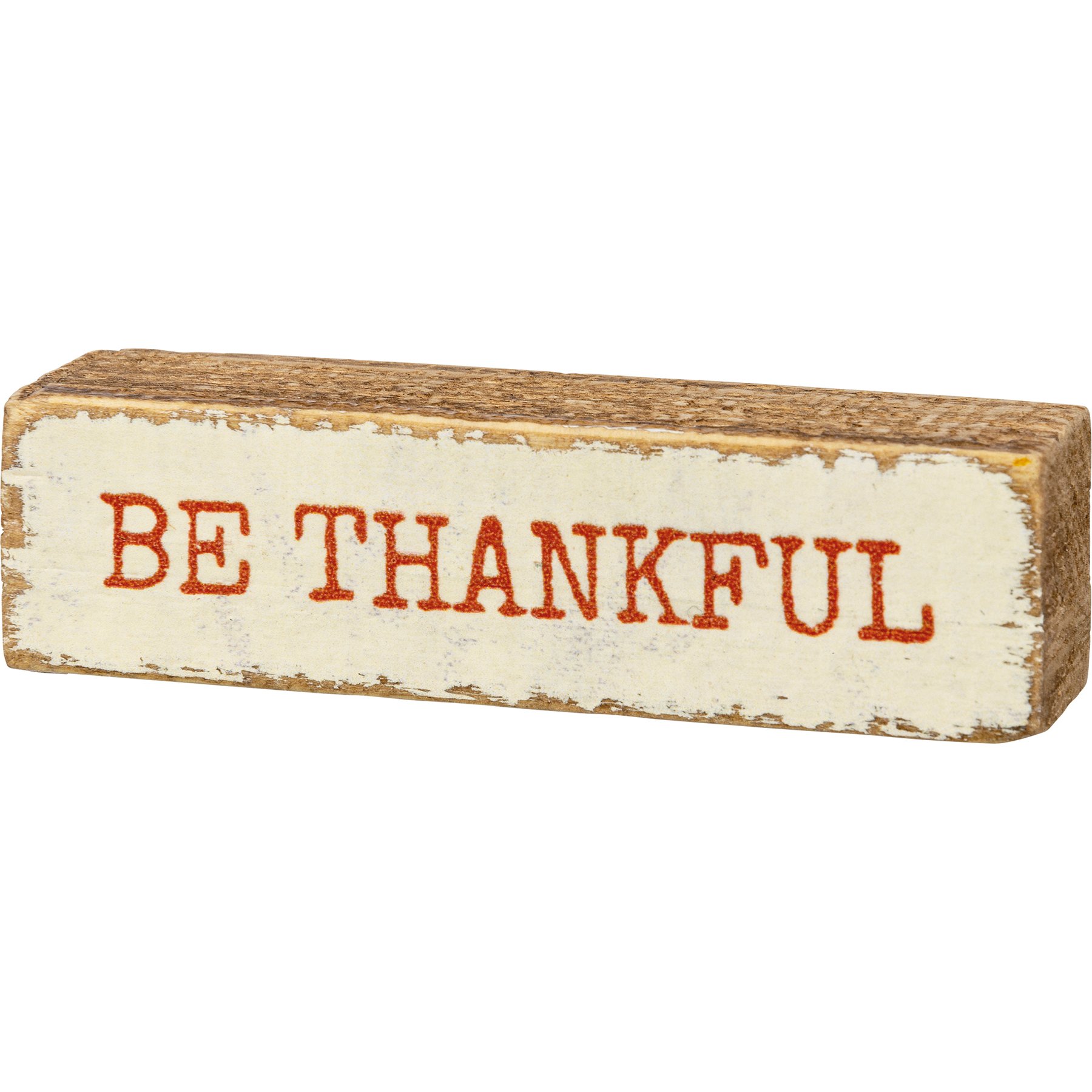 A wooden block sign from our Fall & Harvest Collection features a "Be Thankful" sentiment in orange on a cream background. This Be Thankful wood sign is easy to hang via predrilled keyhole slot or can free-stand alone.