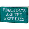 A wooden block sign featuring a "Beach Days Are The Best Days" sentiment in cream on a beachy blue background. Design is replicated from original artwork painted onto burlap canvas, giving the art a unique depth and texture. Distressed white sides make the design pop. Easy to hang via predrilled keyhole slot or can free-stand alone.