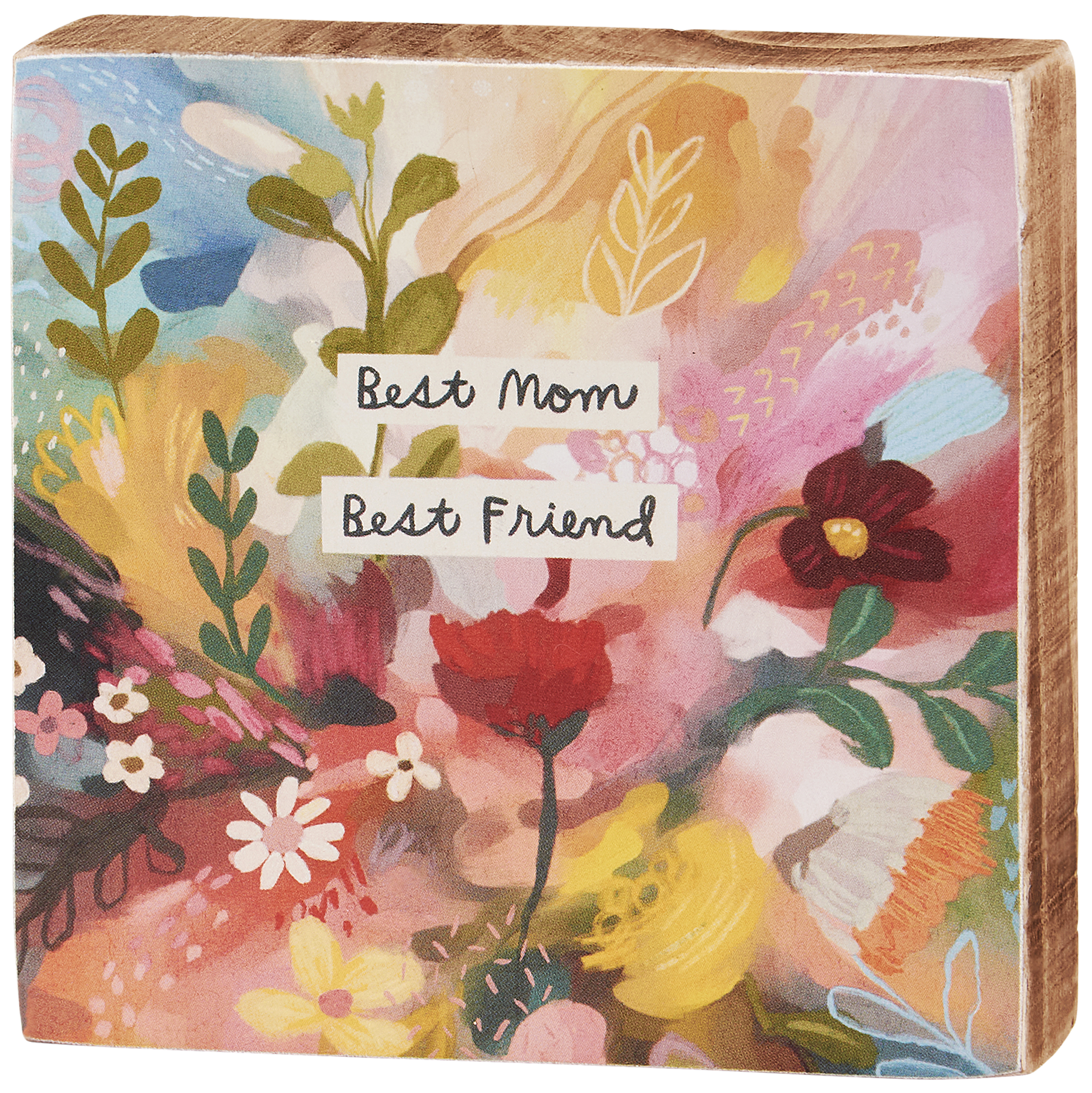 A colorful wooden block sign from our Mother's Day Collection displaying a vibrant hand illustrated design of flowers surrounding a heartwarming mom-themed sentiment that reads "Best Mom - Best Friend." Mom block sign features coordinating natural wood on the sides and back. Our Best Mom Best Friend block sign is easy to hang via predrilled keyhole slot or can free-stand alone. A lovely Mother's Day gift perfect for an everyday home accent.