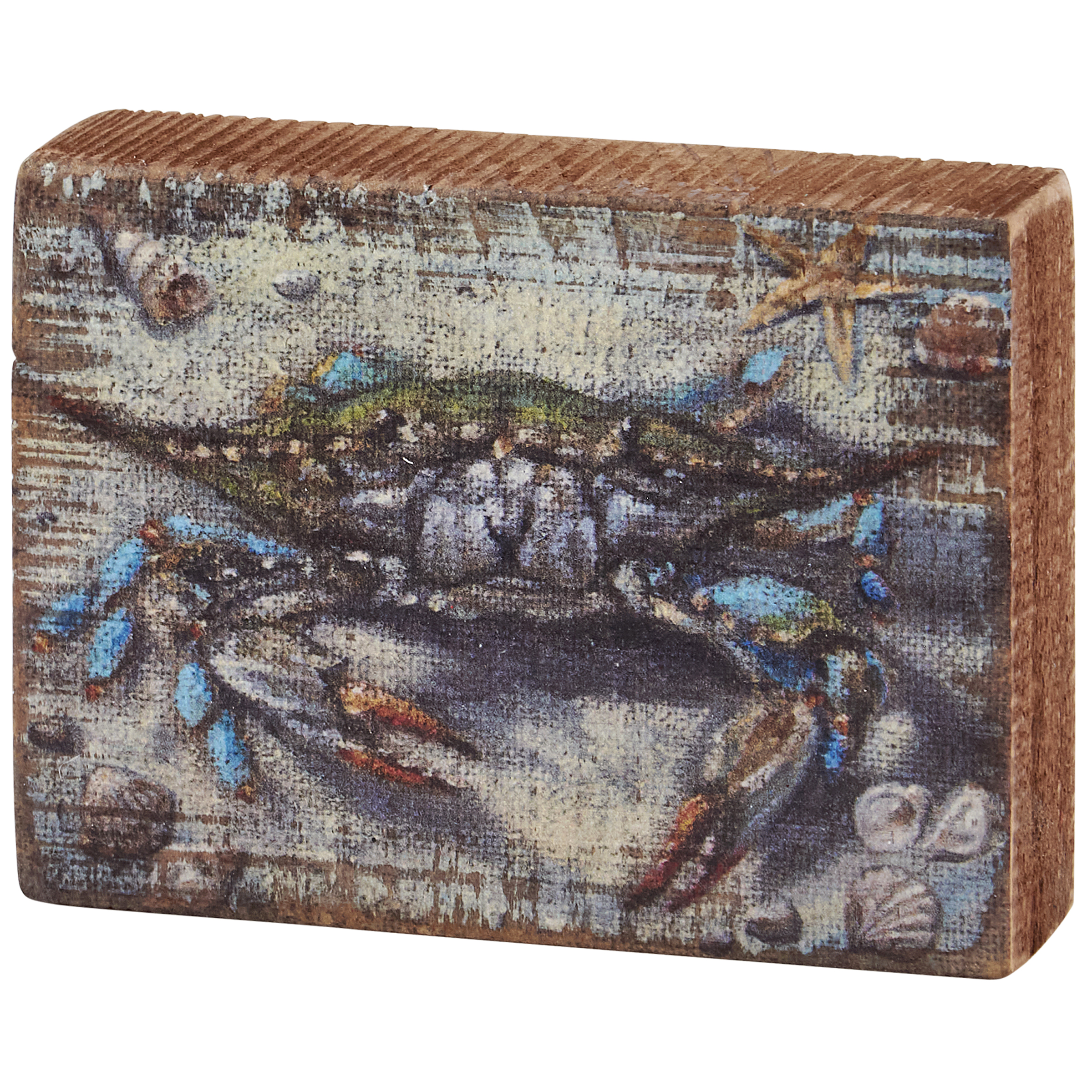 A wooden block sign from our Beach Collection displaying a charming beach inspired design of a blue crab in the sand with seashells. Blue crab design is replicated from original artwork painted onto burlap canvas, giving the art a unique depth and texture. Beach block sign features distressed details with coordinating natural wood on the sides and back. Our Blue Crab block sign is easy to hang via predrilled keyhole slot or can free-stand alone. A rustic beach-themed home accent that can be easily displayed in any home or work space.